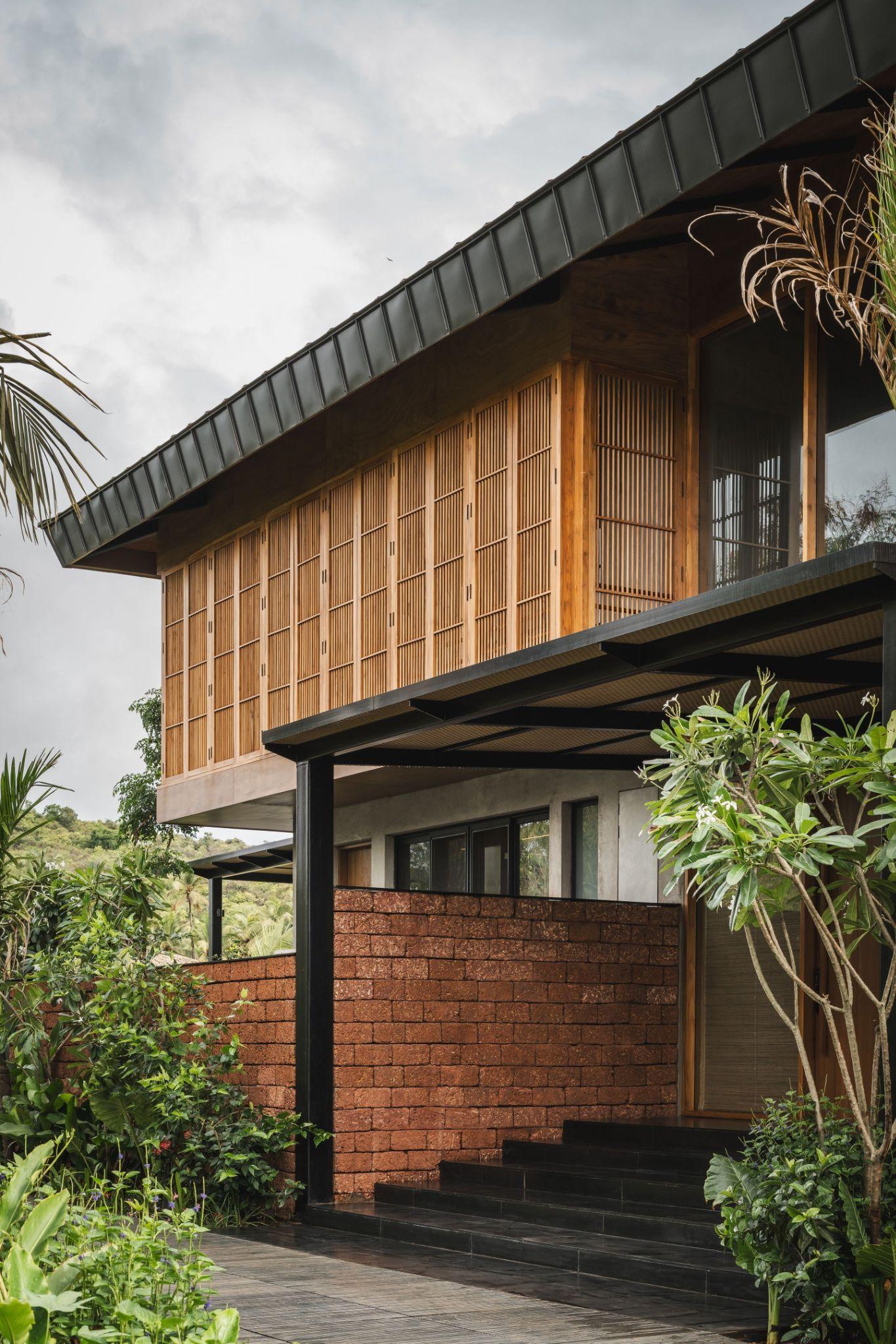 Hệ mái dốc phủ hợp kim tối màu bảo vệ lớp gỗ bên dưới khỏi mưa nắng. Mảng tường đá ong đỏ mang đặc trưng của vùng nhiệt đới Ấn Độ