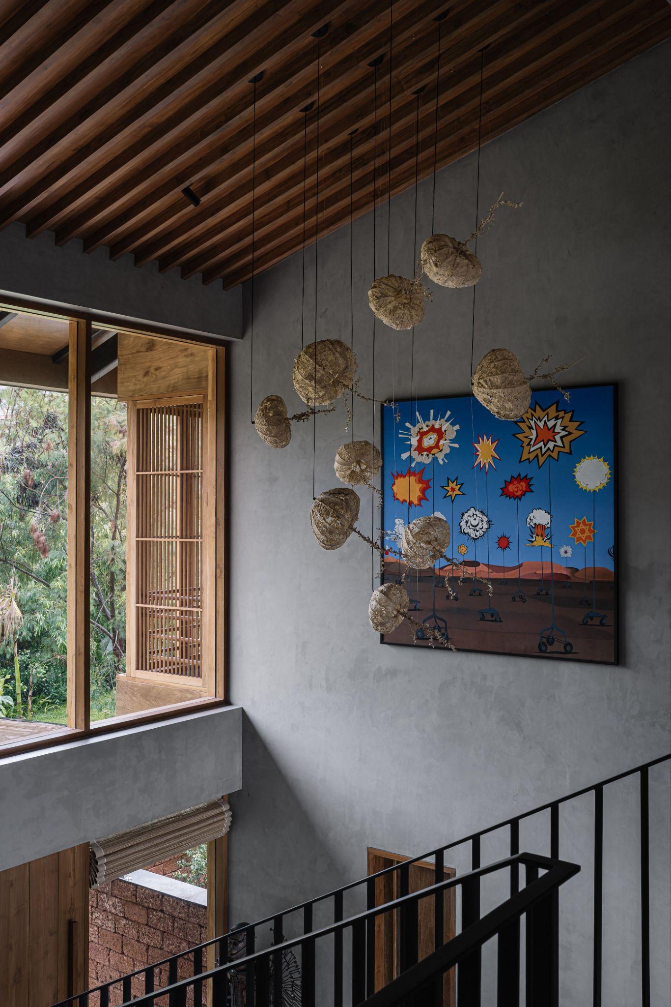 Không gian cầu thang như phòng trưng bày nhỏ, nơi ánh sáng, vật liệu và nghệ thuật giao thoa tinh tế. Bức tường xi măng trở thành phông nền tôn vinh cấu trúc gỗ và những chi tiết điêu khắc mang dấu ấn cá nhân của gia chủ