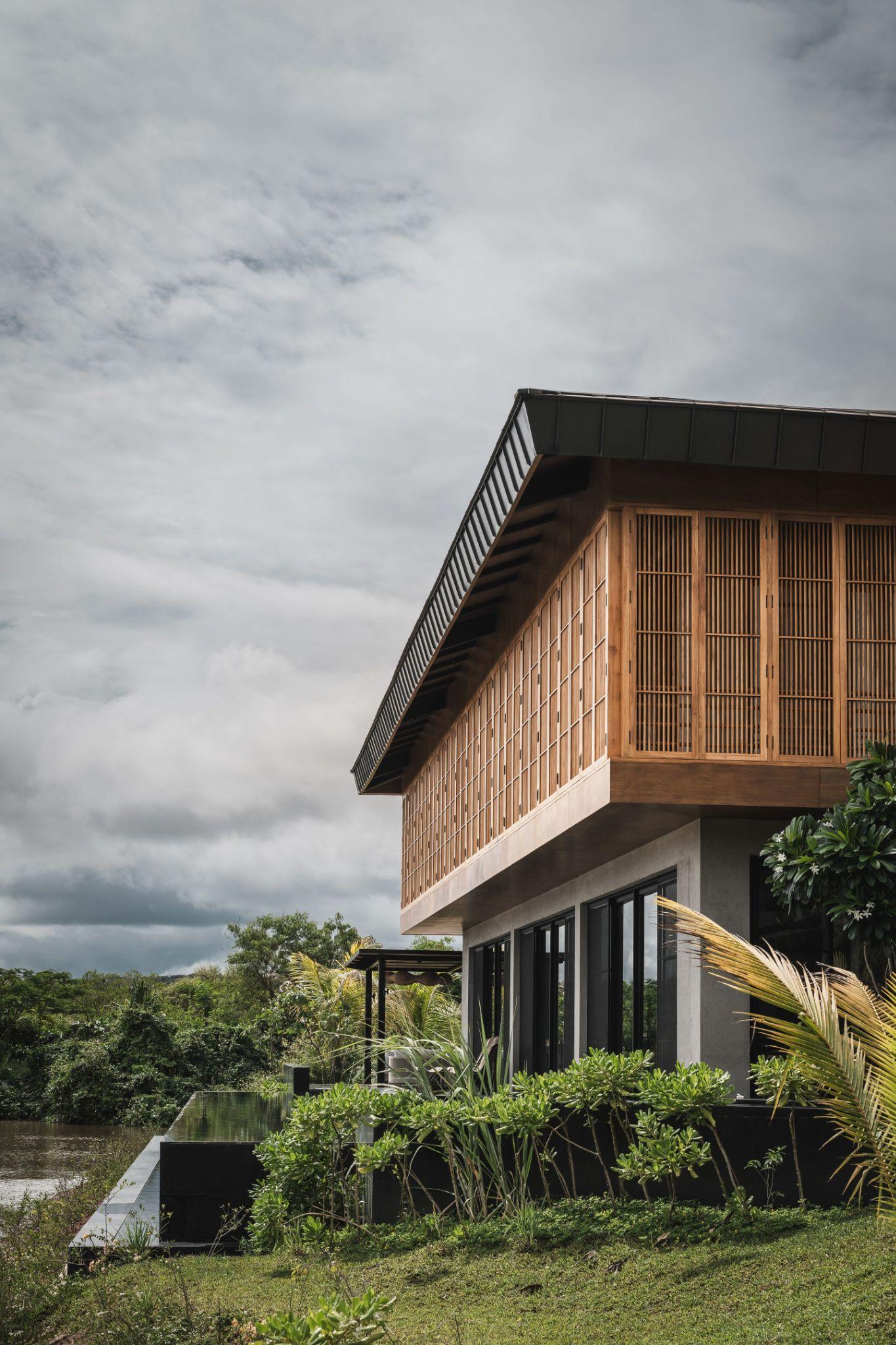 Từ góc nhìn chính diện, tầng gỗ tếch lơ lửng trên nền bê tông vững chãi. Mái dốc kim loại kéo dài giúp bảo vệ khối nhà trước khí hậu nhiệt đới
