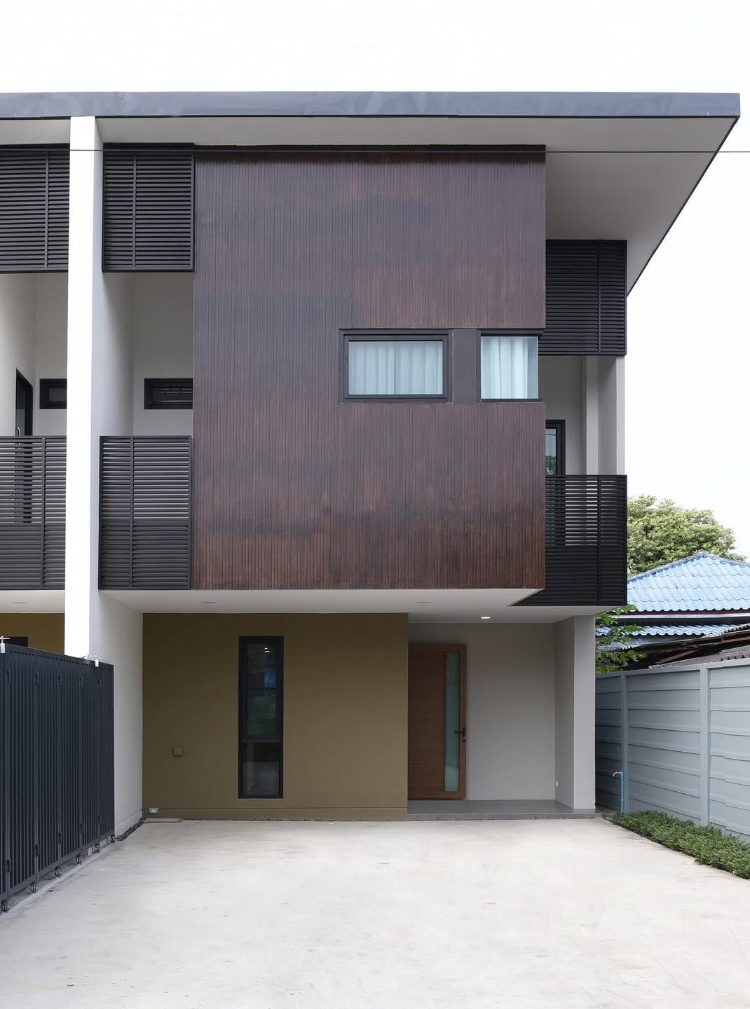 Ngôi nhà hộp 2 tầng với mái lệch nhẹ, cổng sắt màu xám và mặt tiền ốp giả gỗ tông nâu sẫm. Thiết kế hình khối tối giản giúp công trình hiện đại và dễ thi công, đồng thời tông màu gỗ tạo cảm giác ấm áp, gần gũi hơn giữa khu phố.