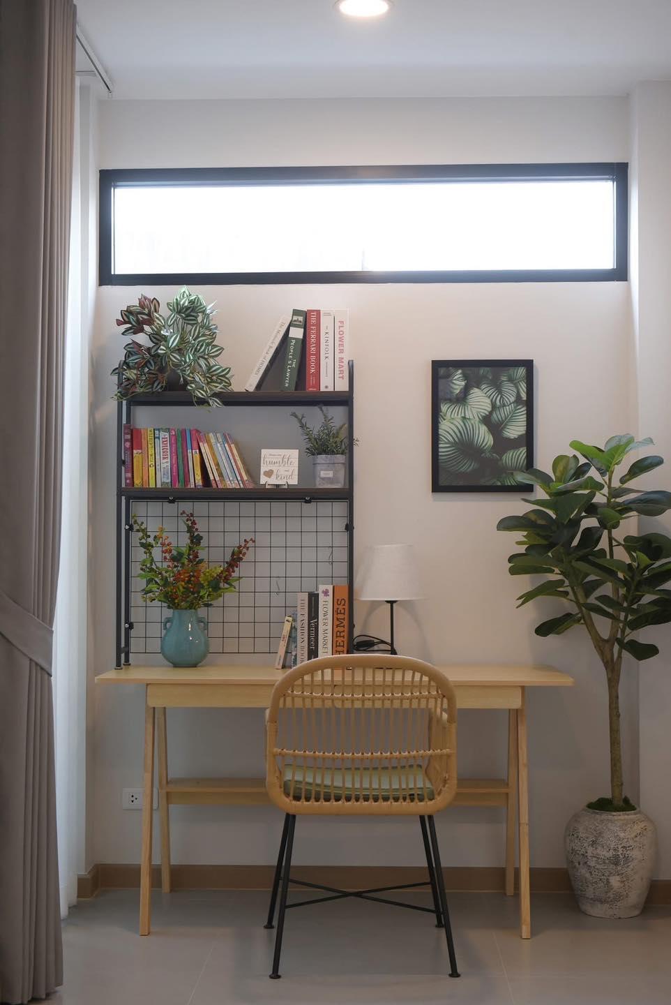 Ngay tại tầng 1, kiến trúc sư bố trí một phòng đa năng – nơi có thể làm việc tại nhà, đọc sách hoặc chuyển đổi thành phòng ngủ phụ khi cần. Góc làm việc này đơn giản nhưng ấm cúng: bàn gỗ sáng màu, giá sách gắn tường, ghế mây nhẹ và cây xanh trang trí.