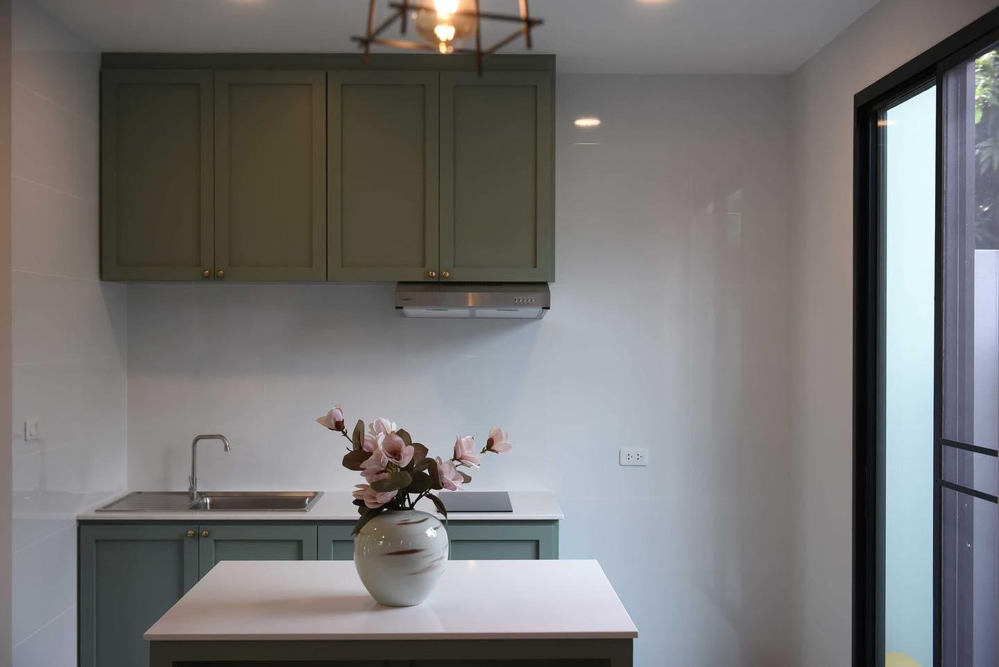 Khu bếp nhỏ gọn với tủ xanh xám dịu và mặt bàn trắng sáng, nhấn bằng bình hoa trang trí. Cửa kính bên cạnh cho phép thoát mùi và đón sáng tự nhiên, giữ cho không gian bếp luôn sạch và thoáng