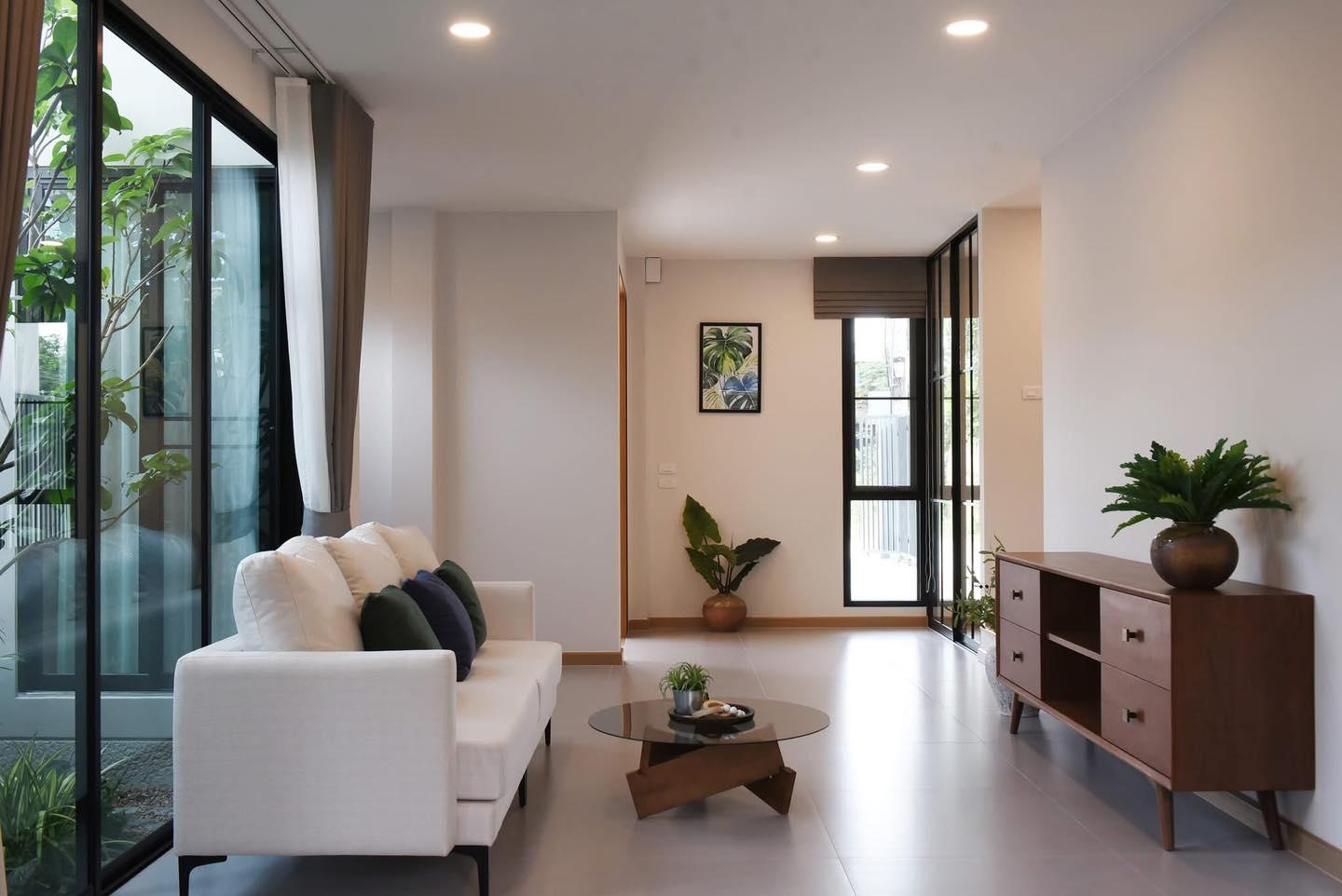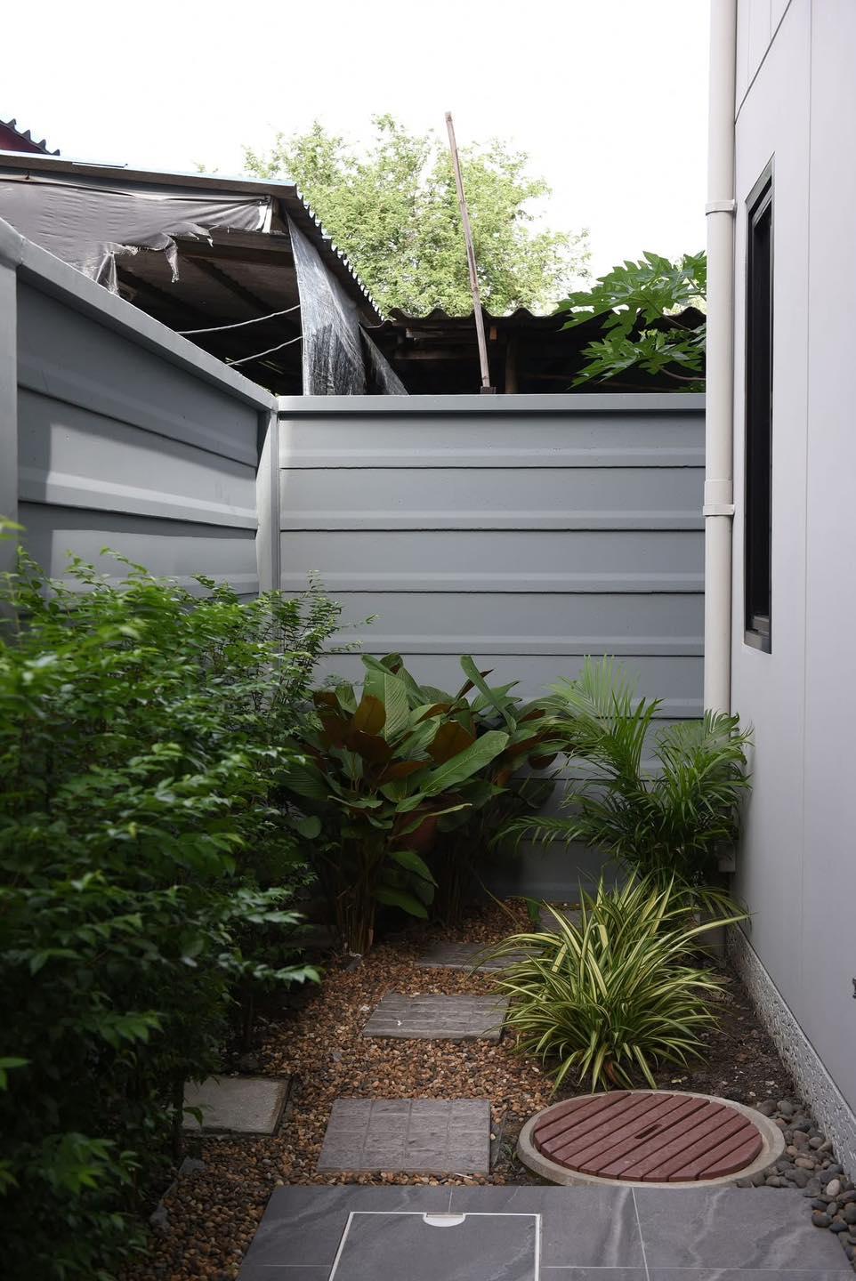 Dù nằm giữa khu dân cư đông đúc, BAAN YINDEE vẫn duy trì được cảm giác “ở giữa thiên nhiên”. Dọc theo hông nhà là một dải sân vườn hẹp, lát đá xen sỏi và trồng các loại cây lá to, cây bụi thấp. Nhìn từ phòng khách, mảng xanh này giống như một “bức tường cây” giúp lọc không khí, làm dịu ánh sáng và tạo riêng tư.