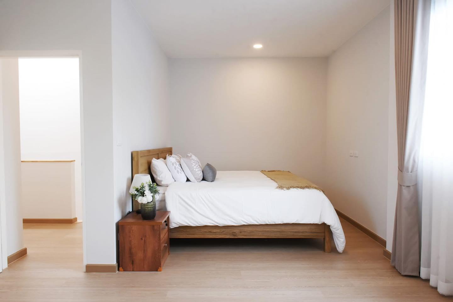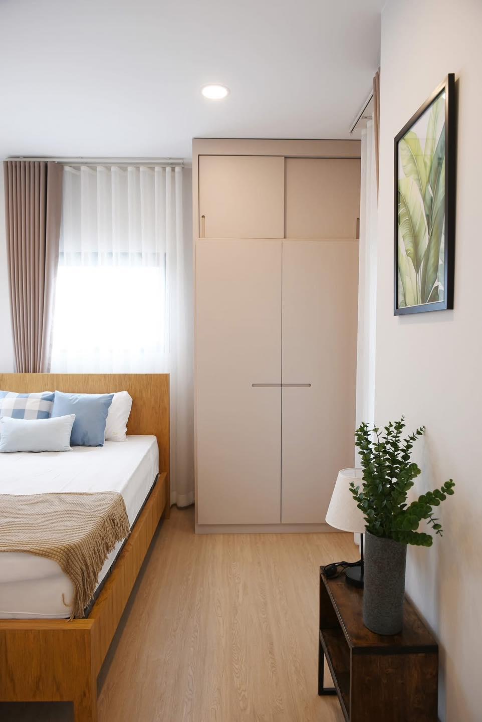 Phòng ngủ chính với giường gỗ sáng, chăn ga trắng và rèm cửa màu be nhạt. Thiết kế tối giản giúp căn phòng toát lên cảm giác yên bình và thư giãn sau ngày dài