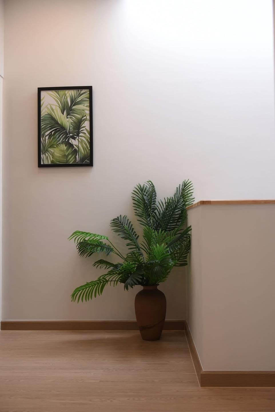 Góc cầu thang tầng trên được điểm bằng chậu cây xanh và tranh lá cọ treo tường. Thiết kế nhỏ gọn nhưng mang lại cảm giác tươi mát, gắn kết thiên nhiên trong ngôi nhà