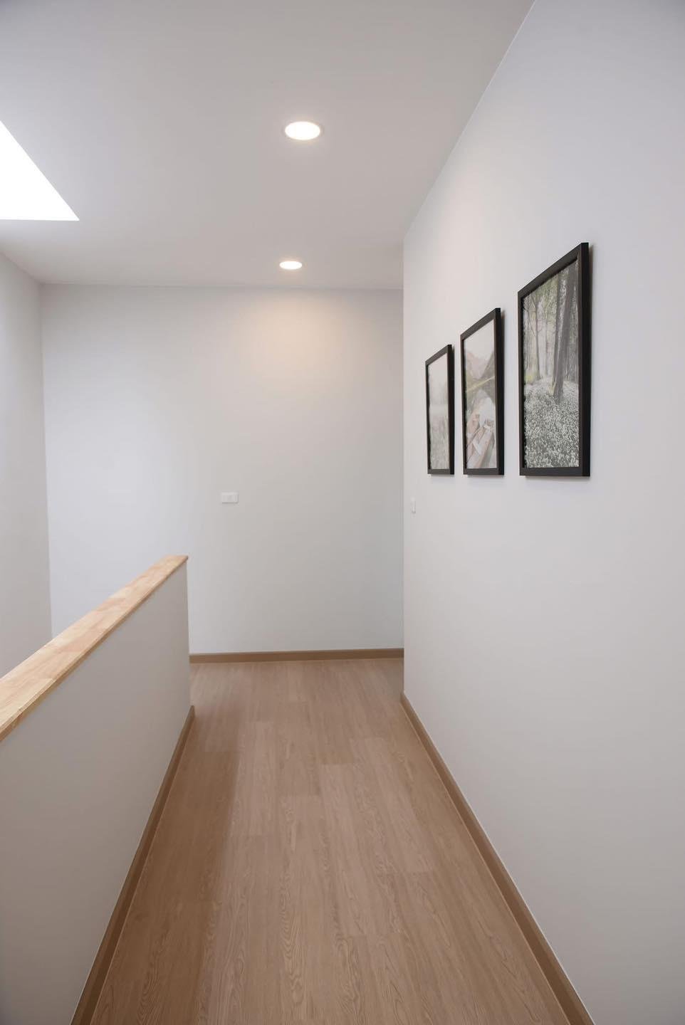 Hành lang tầng trên lát sàn gỗ sáng, treo ba bức tranh ảnh thiên nhiên dọc tường. Ô lấy sáng phía trên giúp khu vực này luôn sáng tự nhiên, giảm phụ thuộc vào đèn điện ban ngày
