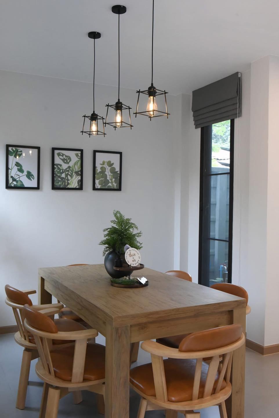 Bàn ăn gỗ mộc với sáu ghế da nâu và cụm đèn treo khung sắt màu đen phía trên. Không gian ăn uống mang vẻ tự nhiên, ấm cúng, là điểm kết nối trung tâm của ngôi nhà