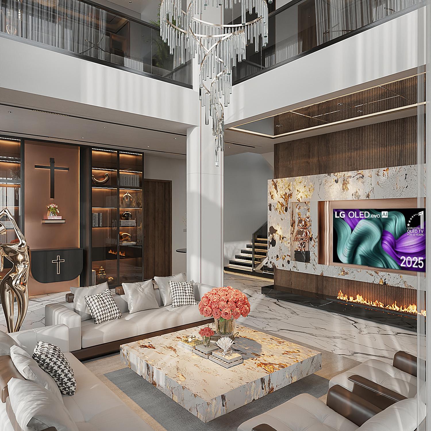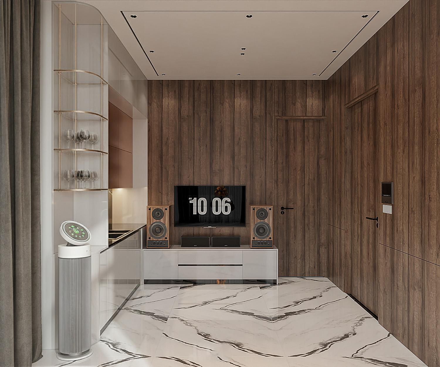 Ở giữa là TV LG OLED evo AI cỡ lớn, đặt âm trong khung ốp đá – vừa là điểm nhấn nghệ thuật, vừa phục vụ cho nhu cầu giải trí. Phía bên là máy lọc không khí LG PuriCare AeroFurniture tích hợp cả đèn, như một món nội thất đa dụng vừa hiện đại vừa thẩm mỹ.