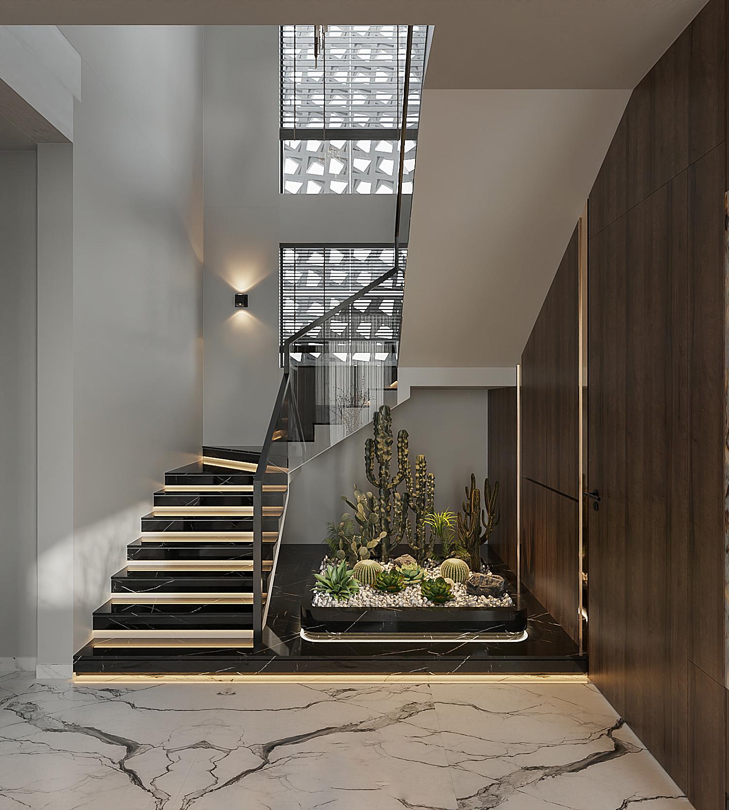Phòng khách được bố trí ở trung tâm tầng 1, với chiều cao trần thông tầng ấn tượng. Mảng tường ốp đá khổ lớn, bàn trà đá tự nhiên và đèn thả xoắn tạo nên hiệu ứng thị giác mạnh mẽ nhưng không hề phô trương.