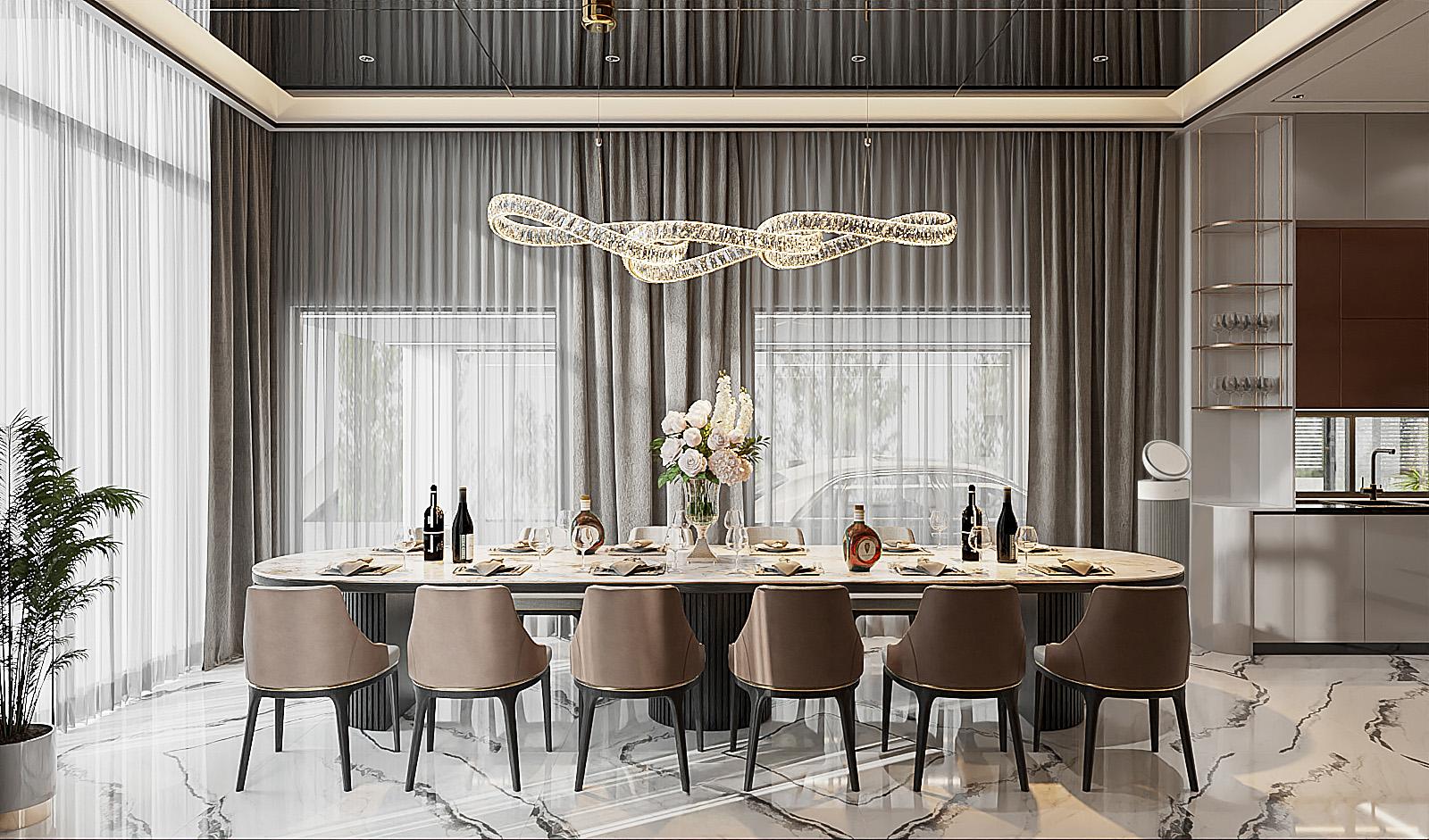 Khu vực bàn ăn và bếp được bố trí liền mạch, tạo nên một không gian sinh hoạt chung rộng lớn. Bàn ăn dài đặt giữa, đủ chỗ cho đại gia đình sum họp. Hệ rèm voan và đá lát sàn vân mây giúp căn phòng sáng thoáng nhưng vẫn sang trọng.