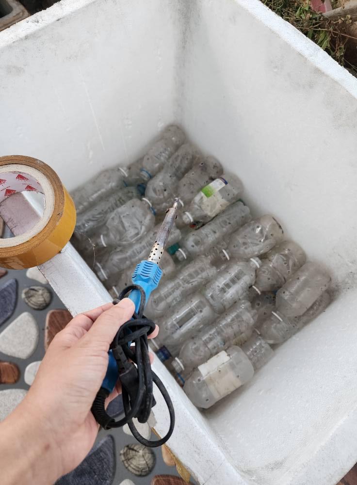 Bước đầu tiên rất quan trọng: chọn thùng xốp kiểu bán thủy canh. Đây là loại thùng có khoang chứa nước phía dưới, cực kỳ tiện nếu gia đình vắng nhà vài hôm. Mình tận dụng vỏ chai nhựa đục lỗ bằng máy hàn thiếc, xếp thành lớp dưới đáy thùng để tạo khoang trữ nước. Sau đó, tạo một lỗ thoát nước cách lớp chai khoảng 1–2cm. Bọc ngoài bằng băng dính màu giúp tăng độ bền và thẩm mỹ.