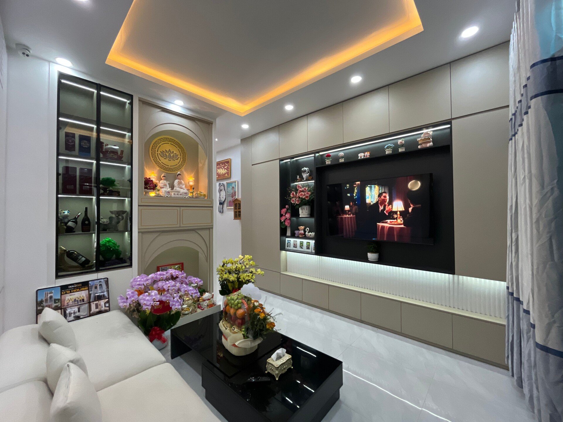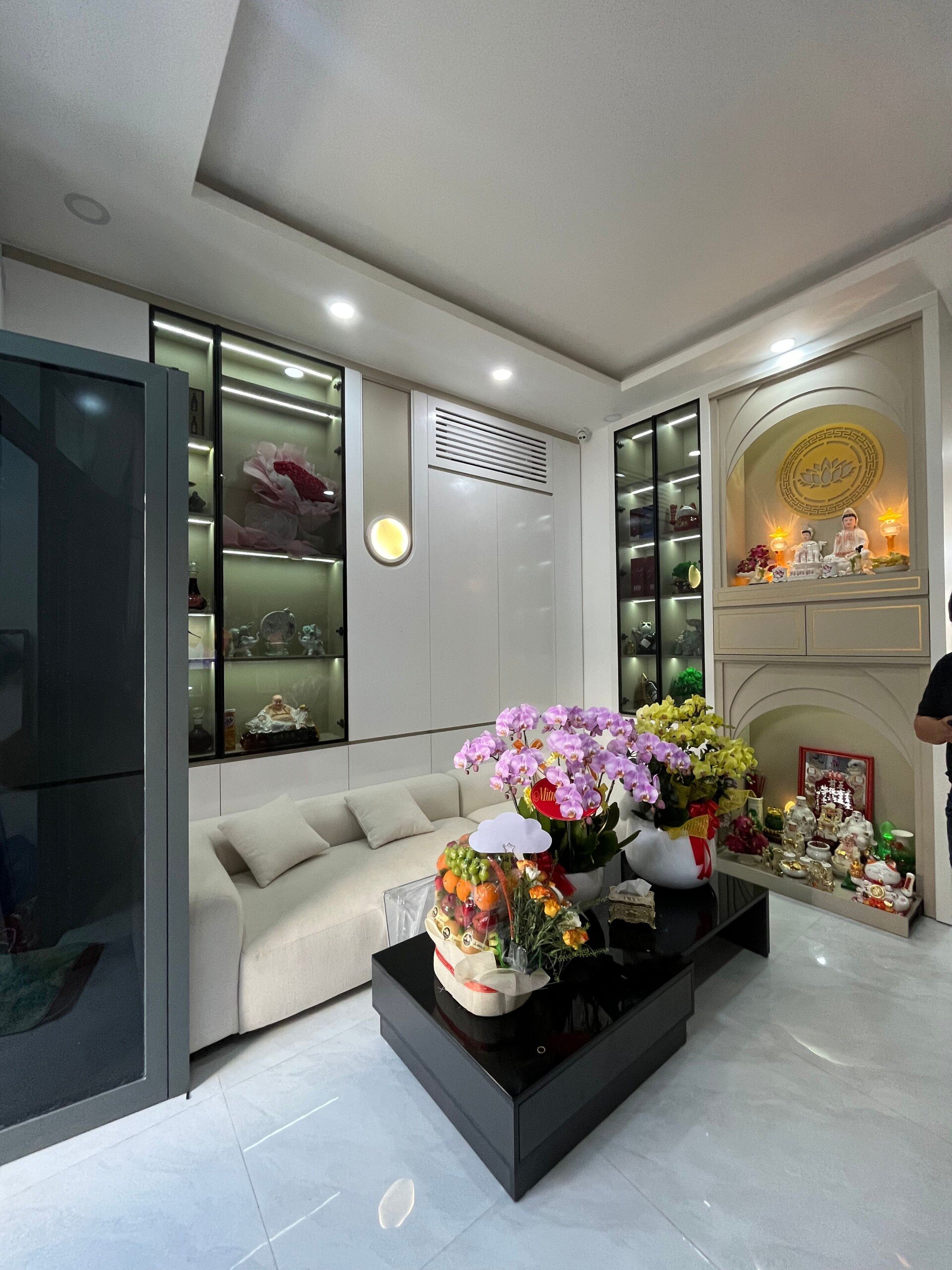 Trần giật cấp kết hợp đèn hắt vàng mang lại ánh sáng ấm áp, cân bằng cho tổng thể. Hệ tủ trưng bày âm tường hai bên bố trí đèn LED hắt khe để lưu trữ, đồng thời tạo điểm nhấn thẩm mỹ. Bàn thờ đặt trang trọng giữa không gian, kết hợp khéo léo với các mảng tủ kính và tường ốp panel, gợi cảm giác tôn nghiêm nhưng vẫn hài hòa với lối sống hiện đại.