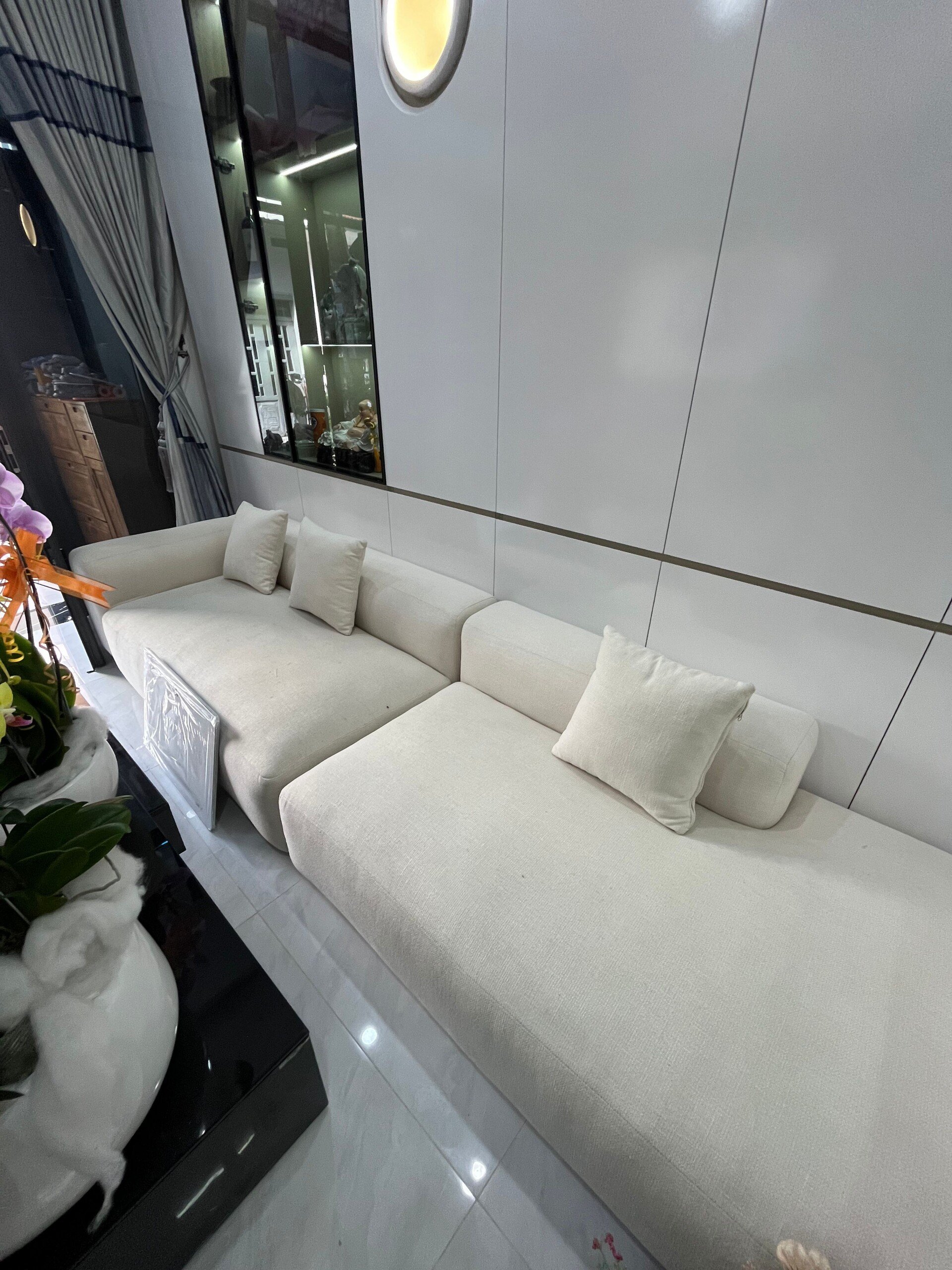 Bộ sofa màu sáng đặt sát tường, tạo lối di chuyển thông thoáng và tối ưu diện tích hiệu quả