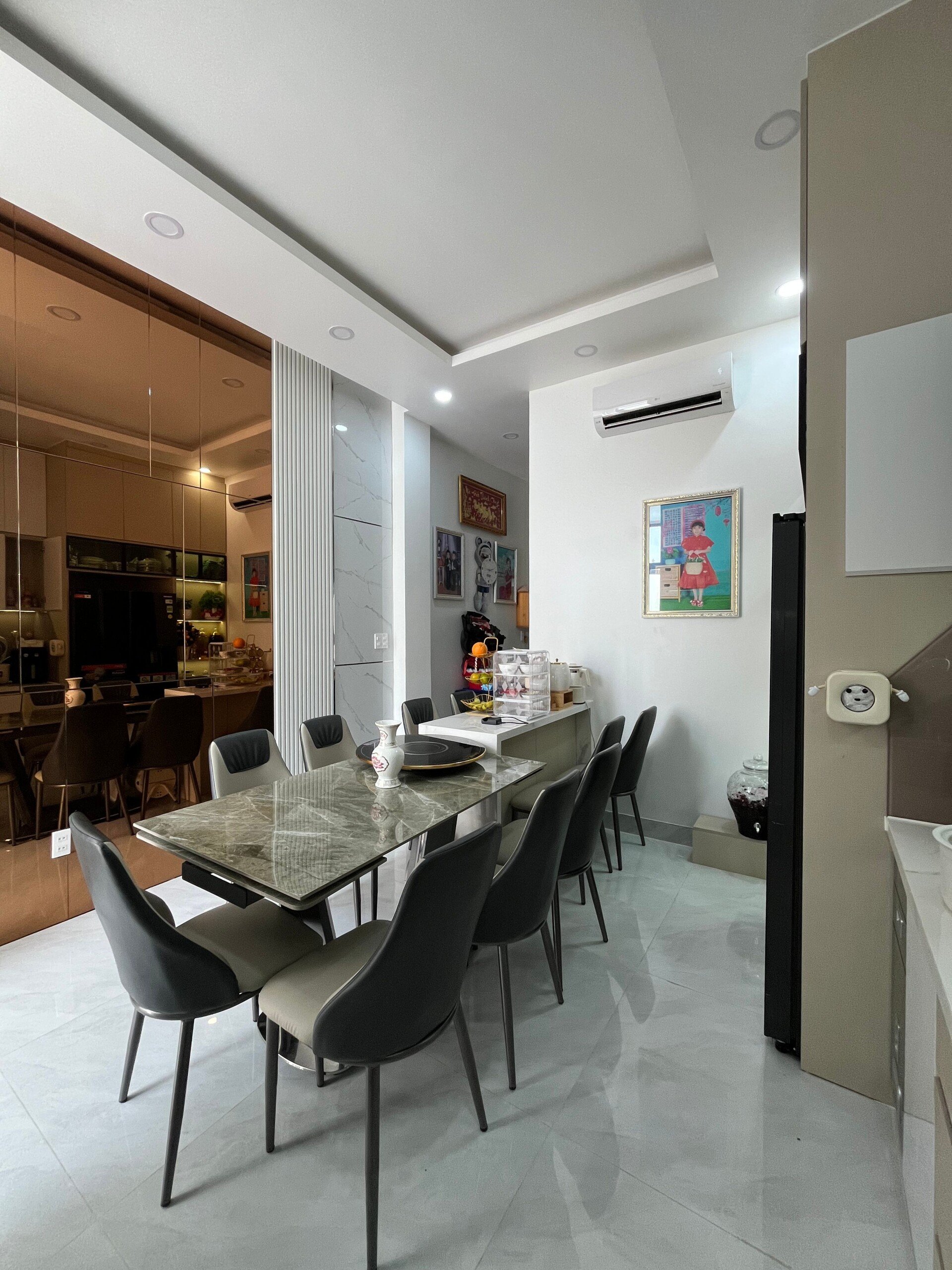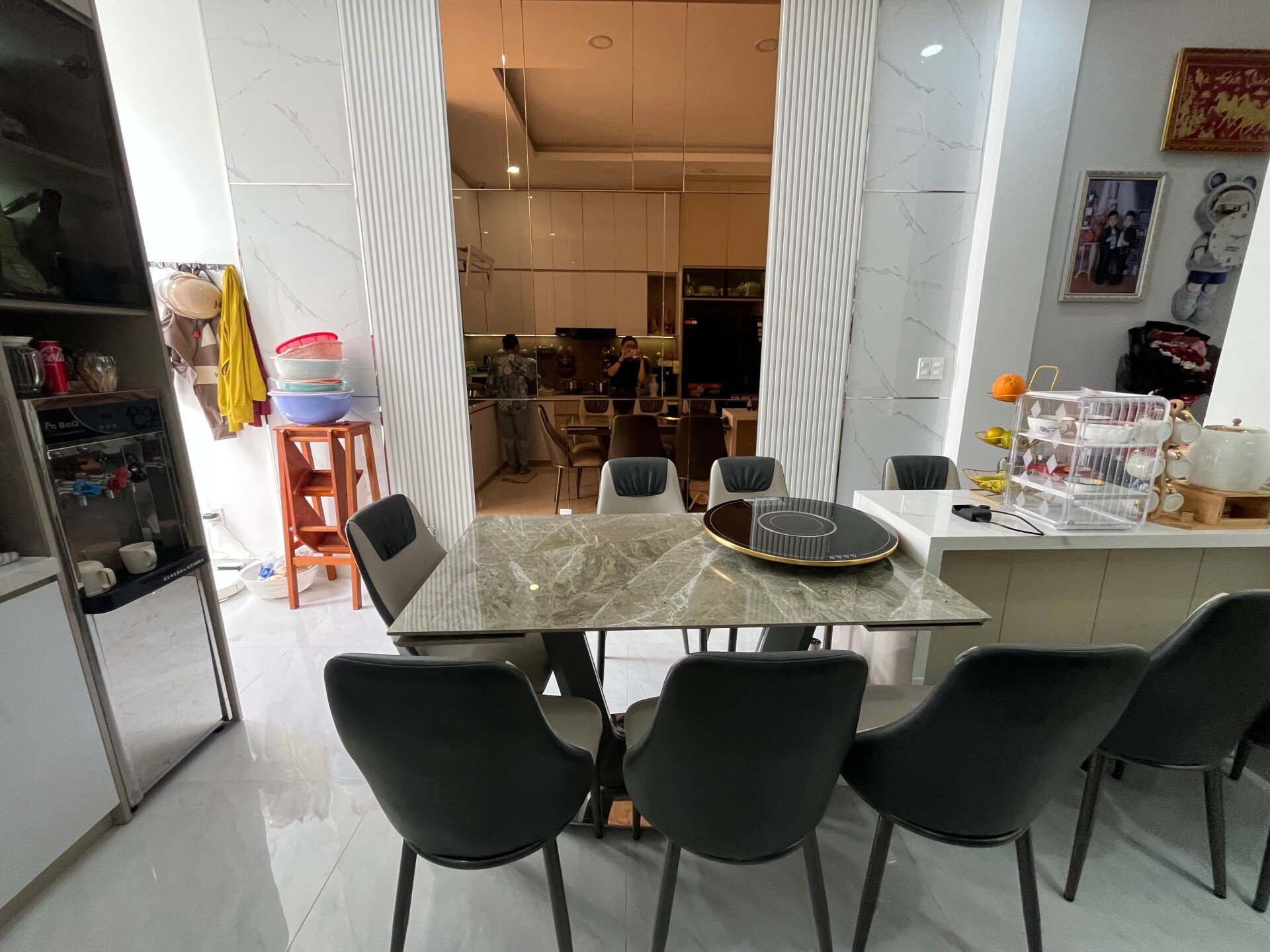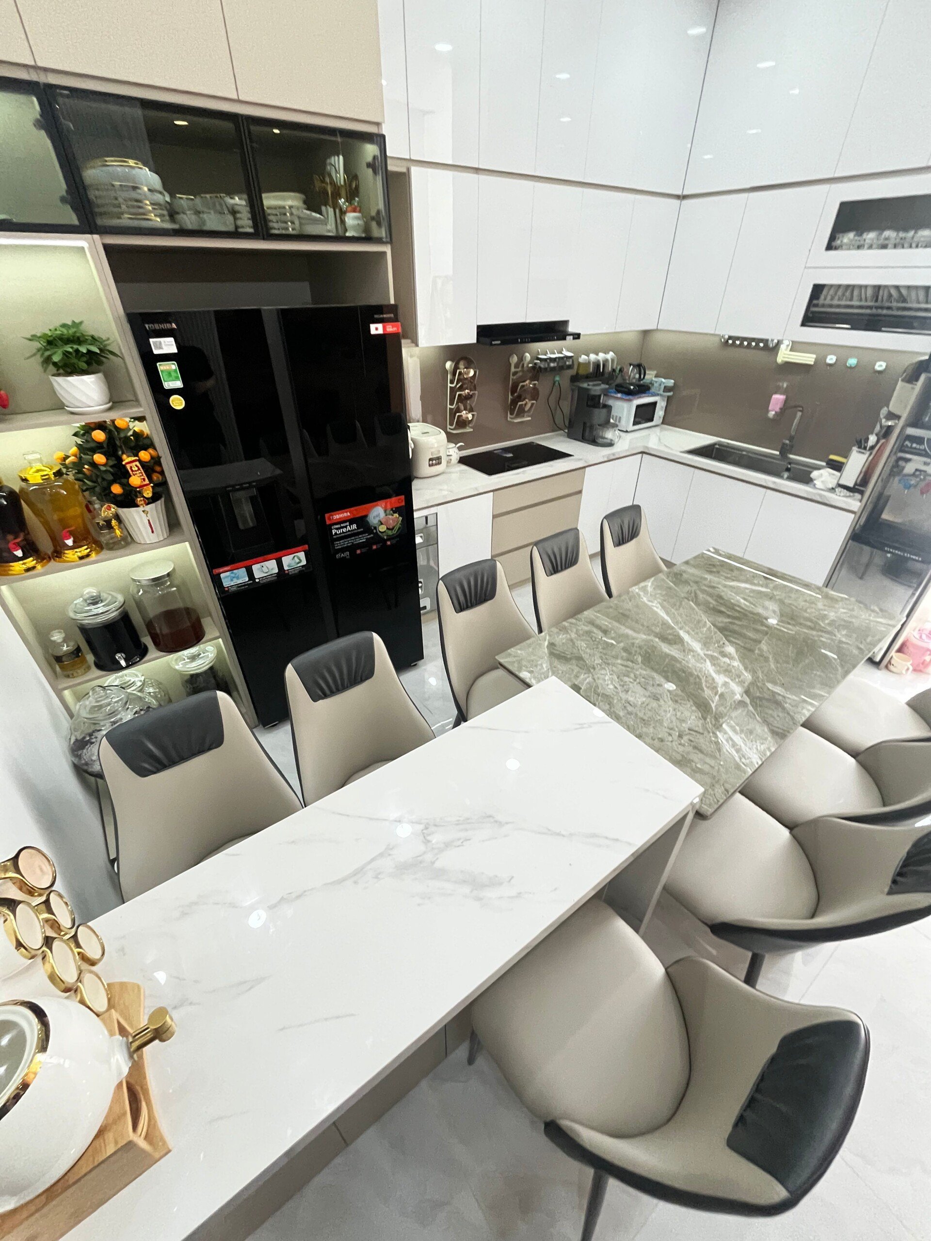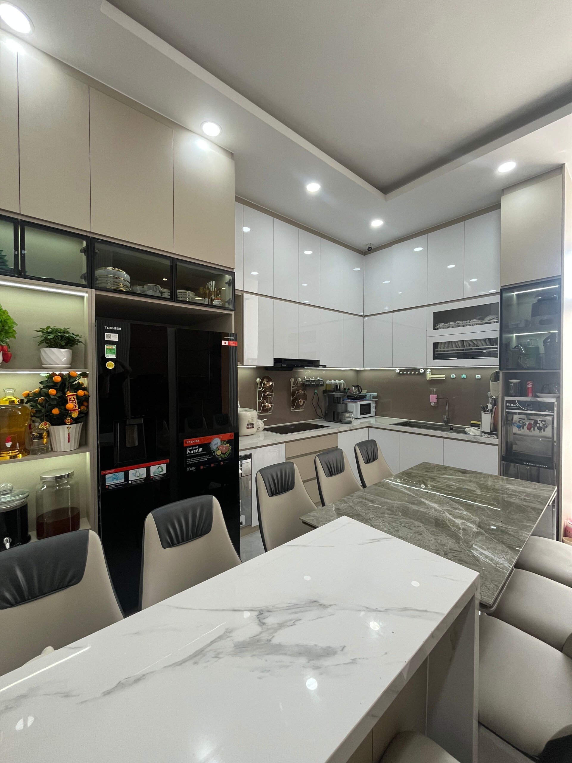 Không gian ăn uống bố trí liền mạch với khu vực nấu nướng, tạo sự liên kết giữa các thành viên trong gia đình. Các thiết bị gia dụng hiện đại bố trí khoa học, tủ lạnh, lò nướng và máy rửa chén đều âm tường, giúp không gian bếp gọn gàng và đồng bộ.