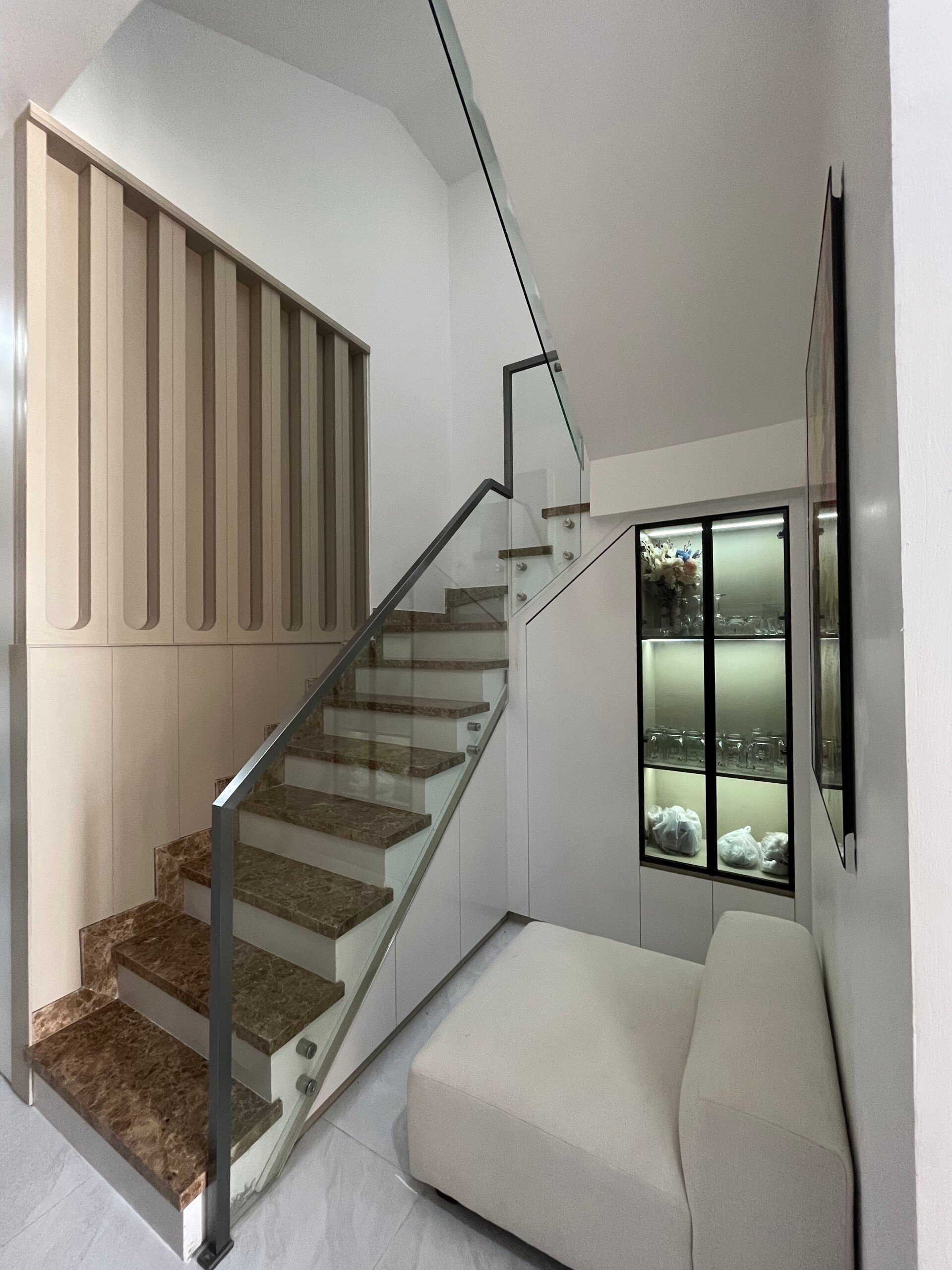 Lan can cầu thang làm bằng chất liệu kính, giúp các khu vực chức năng trong nhà 3 tầng kết nối với nhau theo chiều dọc