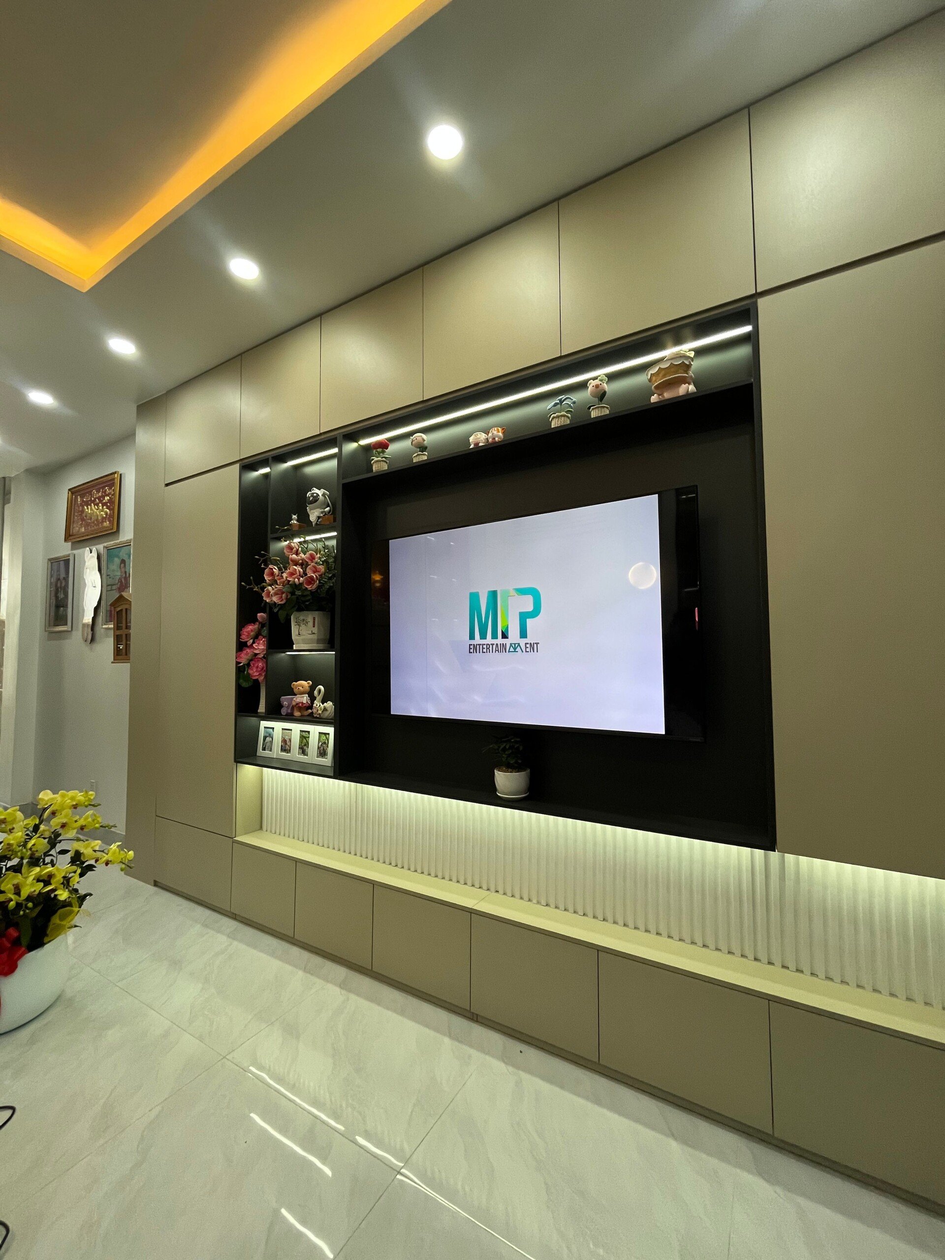 Kệ tivi âm tường giúp không gian phòng khách gọn gàng, tạo thêm khoảng trống để các bé vui chơi thoải mái