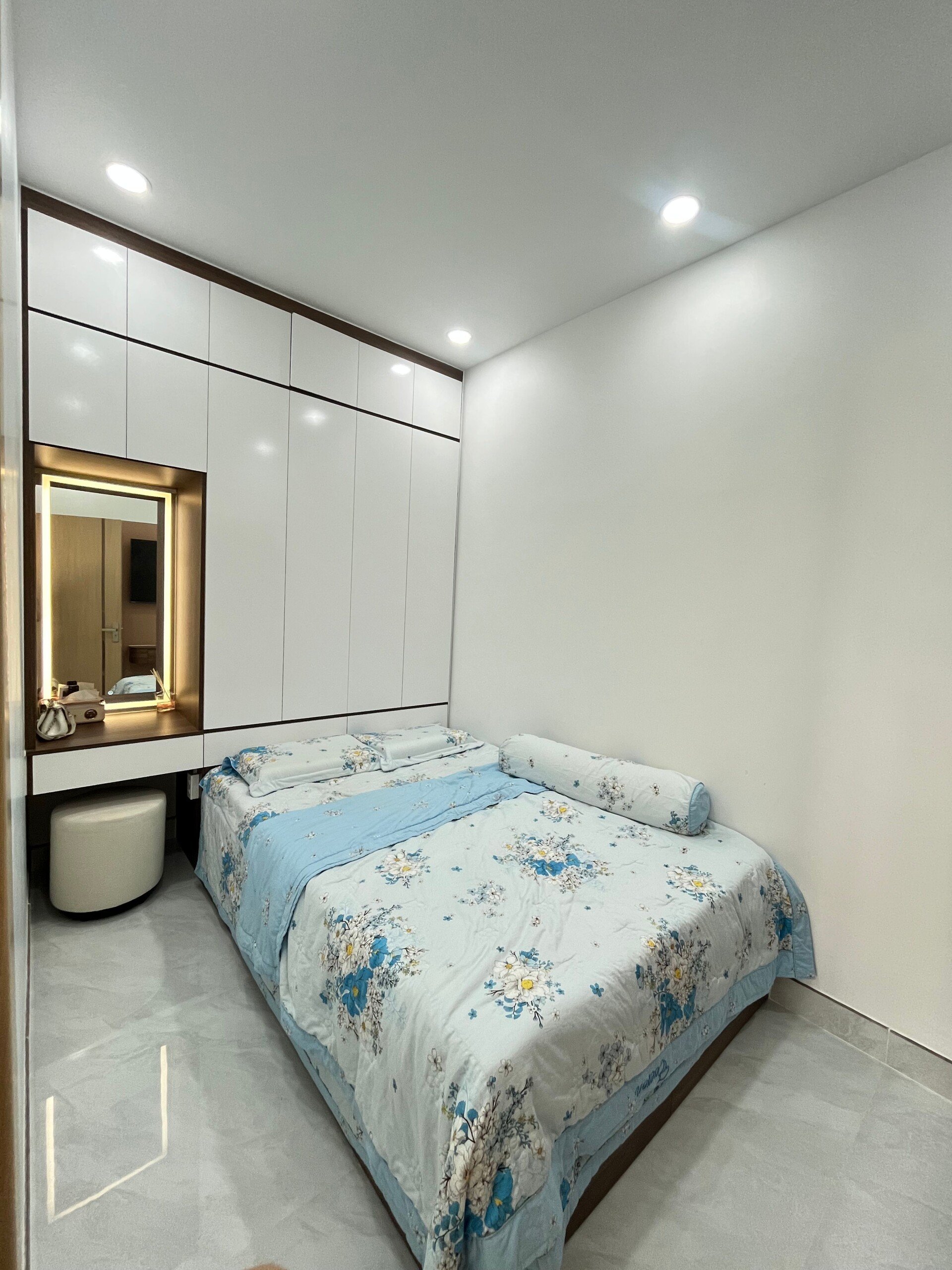 Một phòng ngủ khác sử dụng gam màu trắng và xanh pastel nhẹ nhàng, nội thất bố trí tinh gọn với tủ âm tường kịch trần, bàn trang điểm nhỏ gọn kết hợp gương đèn LED tạo chiều sâu cho không gian. Ánh sáng dịu từ hệ đèn âm trần giúp căn phòng luôn sáng nhưng vẫn êm ái, mang lại cảm giác thư thái cho người sử dụng.