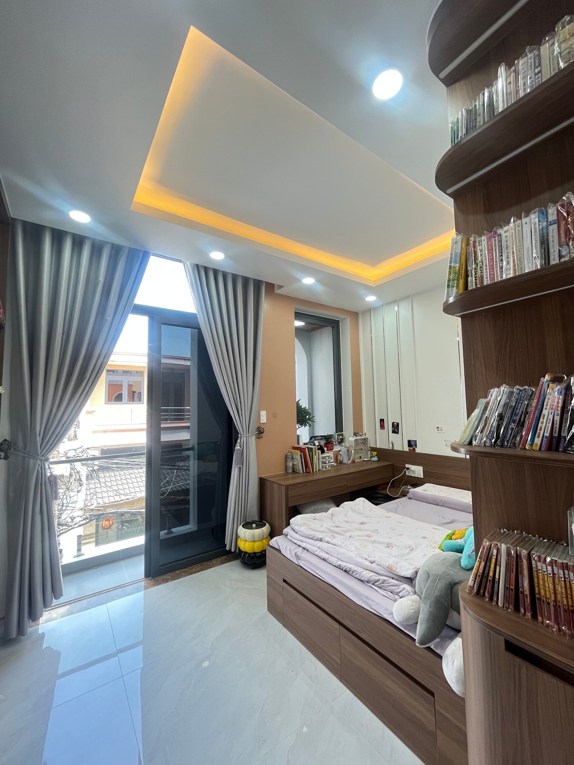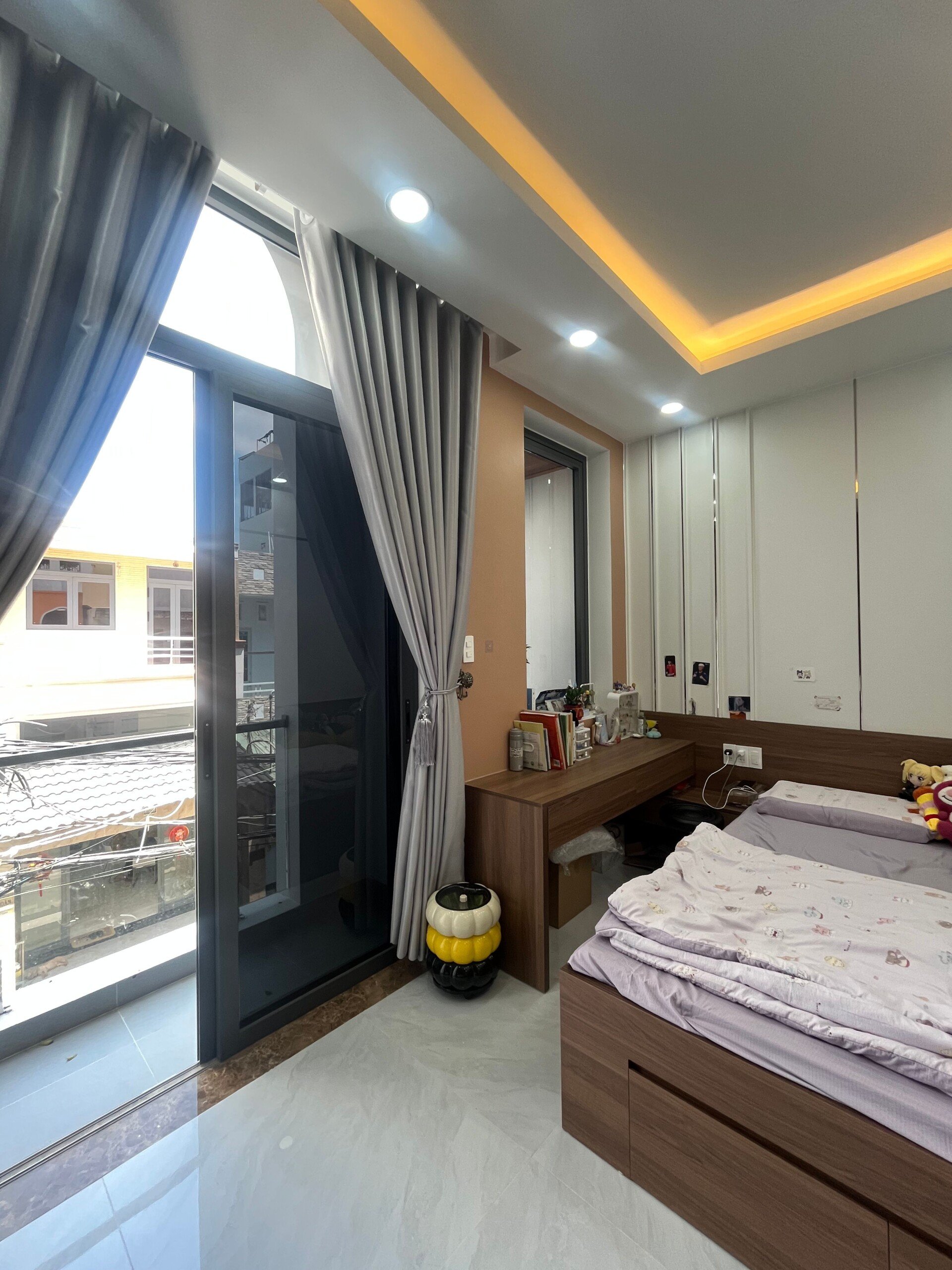 Phòng ngủ của cô con gái lớn có ban công rộng và cửa kính mở ra phố, đón nắng sớm và gió tự nhiên. Giường gỗ tích hợp hộc kéo lưu trữ, kệ sách bo cong mềm mại, bàn học liền giường giúp tối ưu diện tích mà vẫn đầy đủ tiện nghi. Những chi tiết gỗ ấm hòa cùng sắc trắng thanh thoát giúp căn phòng hiện đại, gần gũi, phản ánh tinh thần sống giản dị, ấm áp của gia đình năm mẹ con.