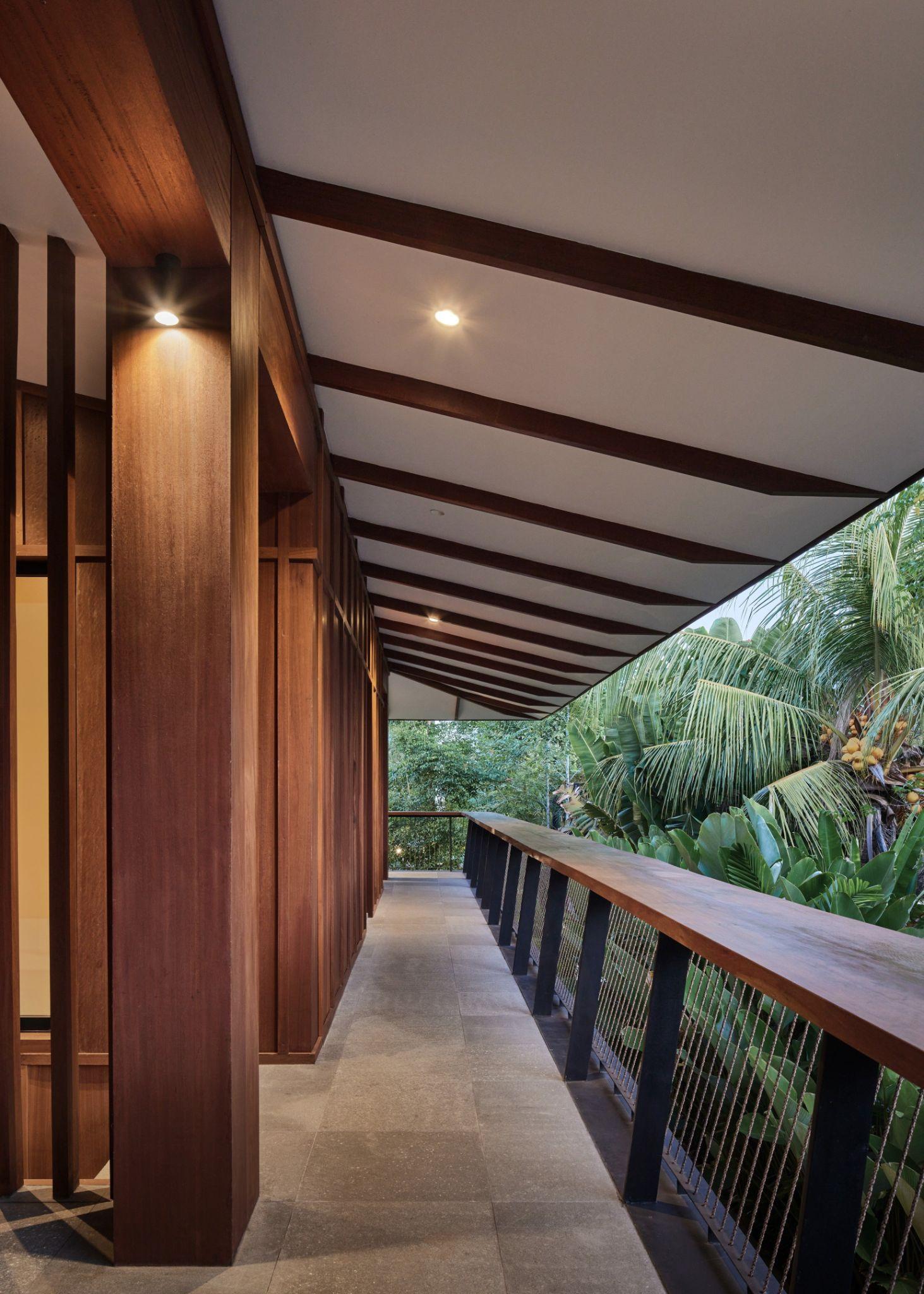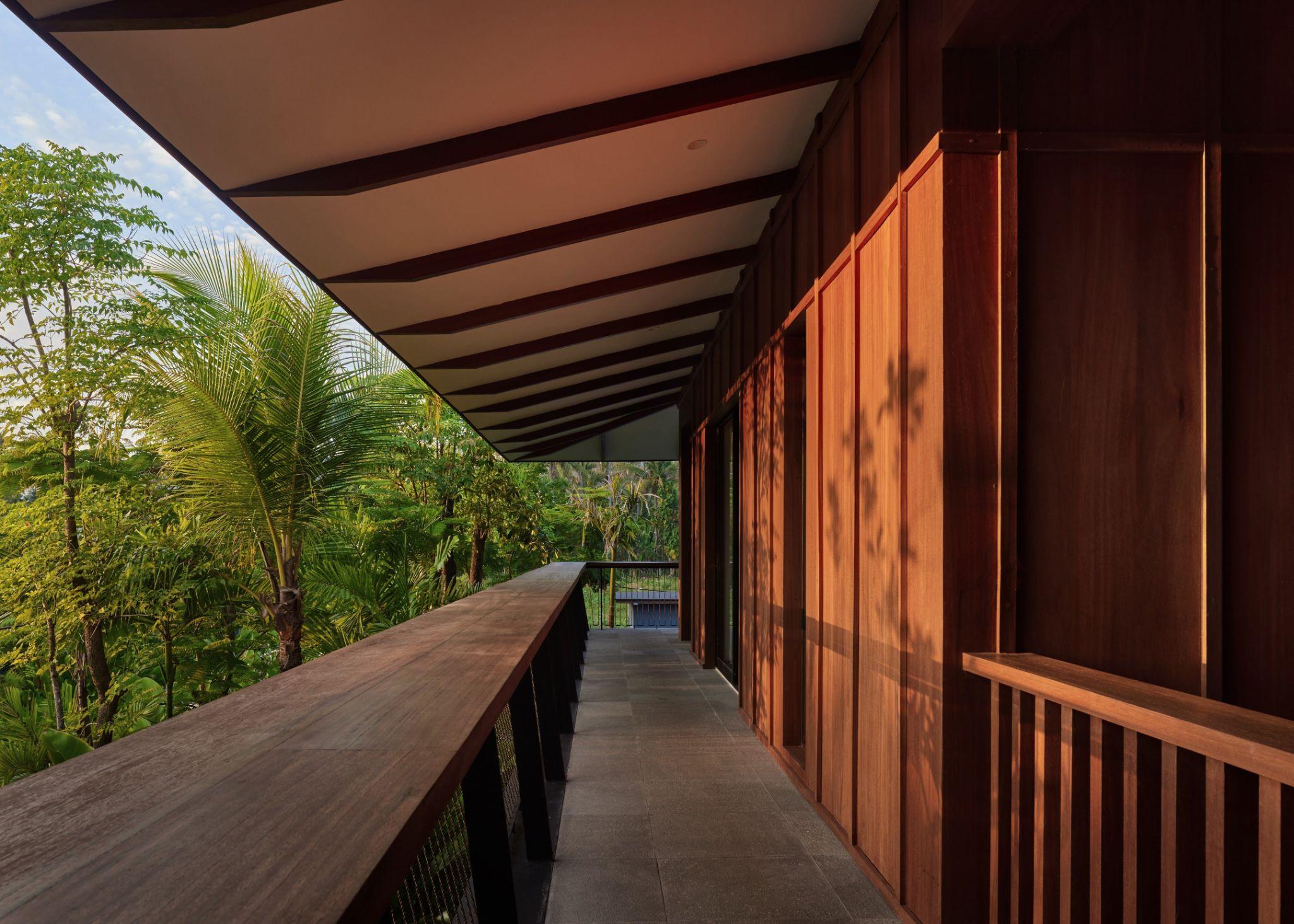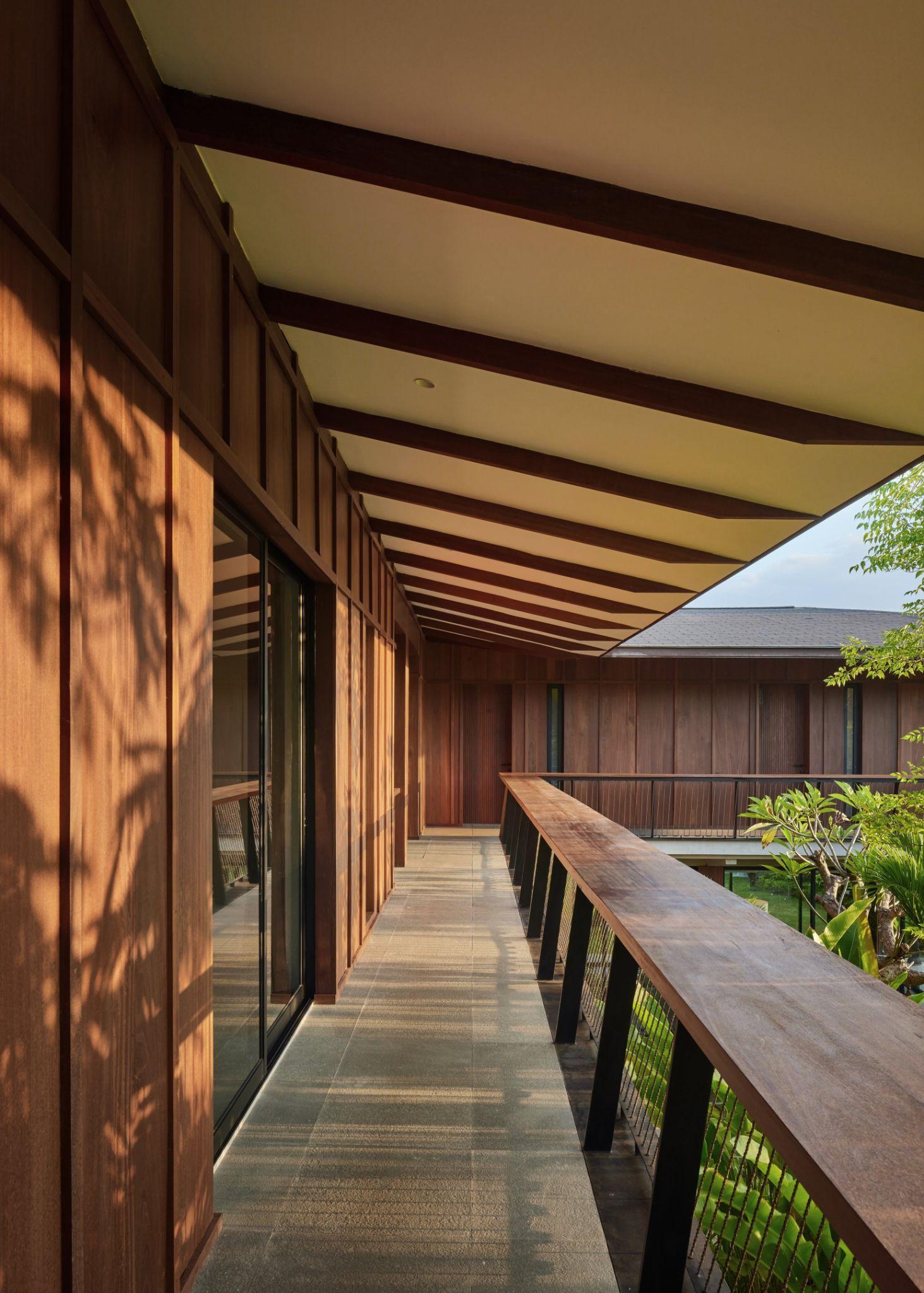 Hành lang gỗ dài với lan can kim loại mảnh kết nối các khối phòng ngủ. Khi chiều buông, ánh nắng vàng phủ lên mặt gỗ, tạo không khí ấm cúng và tĩnh tại