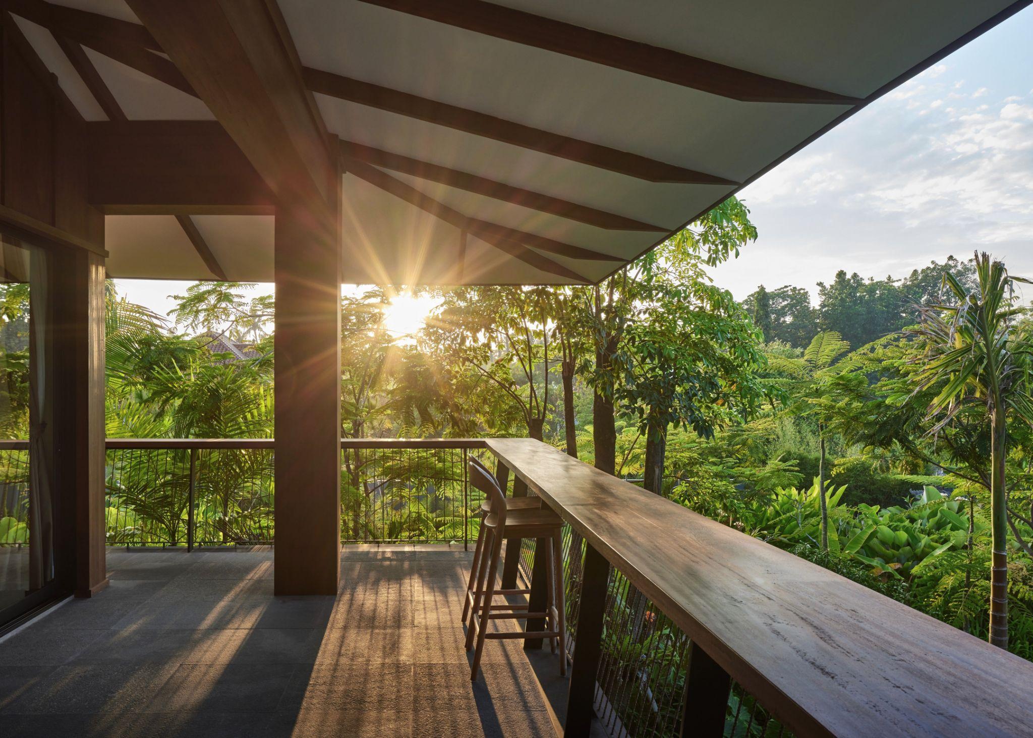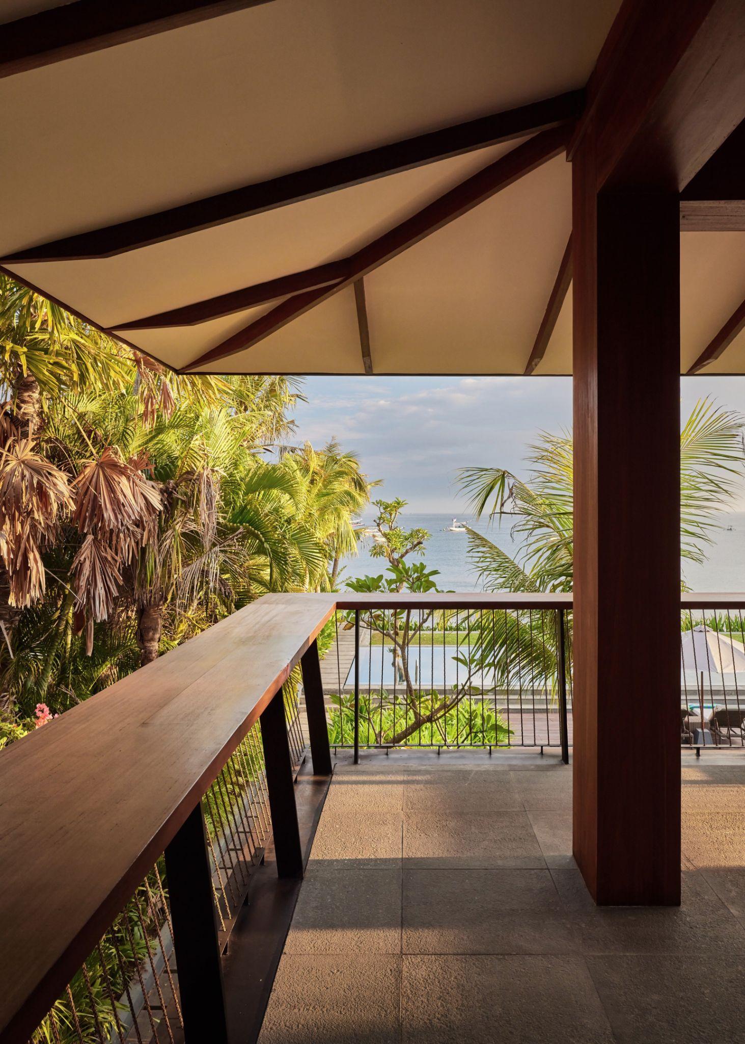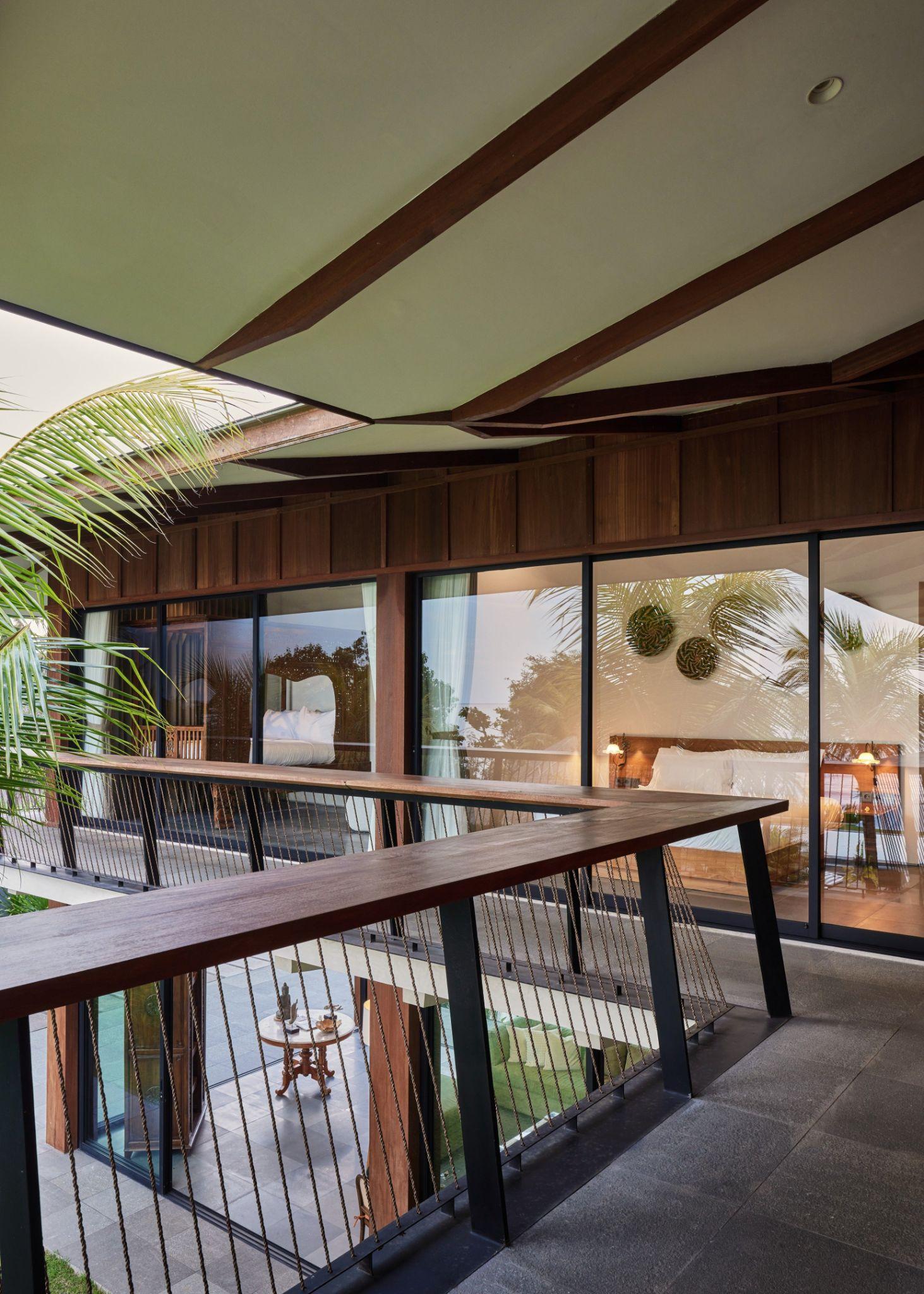 Ban công tầng trên kết nối các phòng riêng tư, hướng thẳng ra biển Bali xanh ngắt. Hệ cửa kính lớn cho phép ánh sáng tràn vào, đồng thời phản chiếu bóng dừa và bầu trời