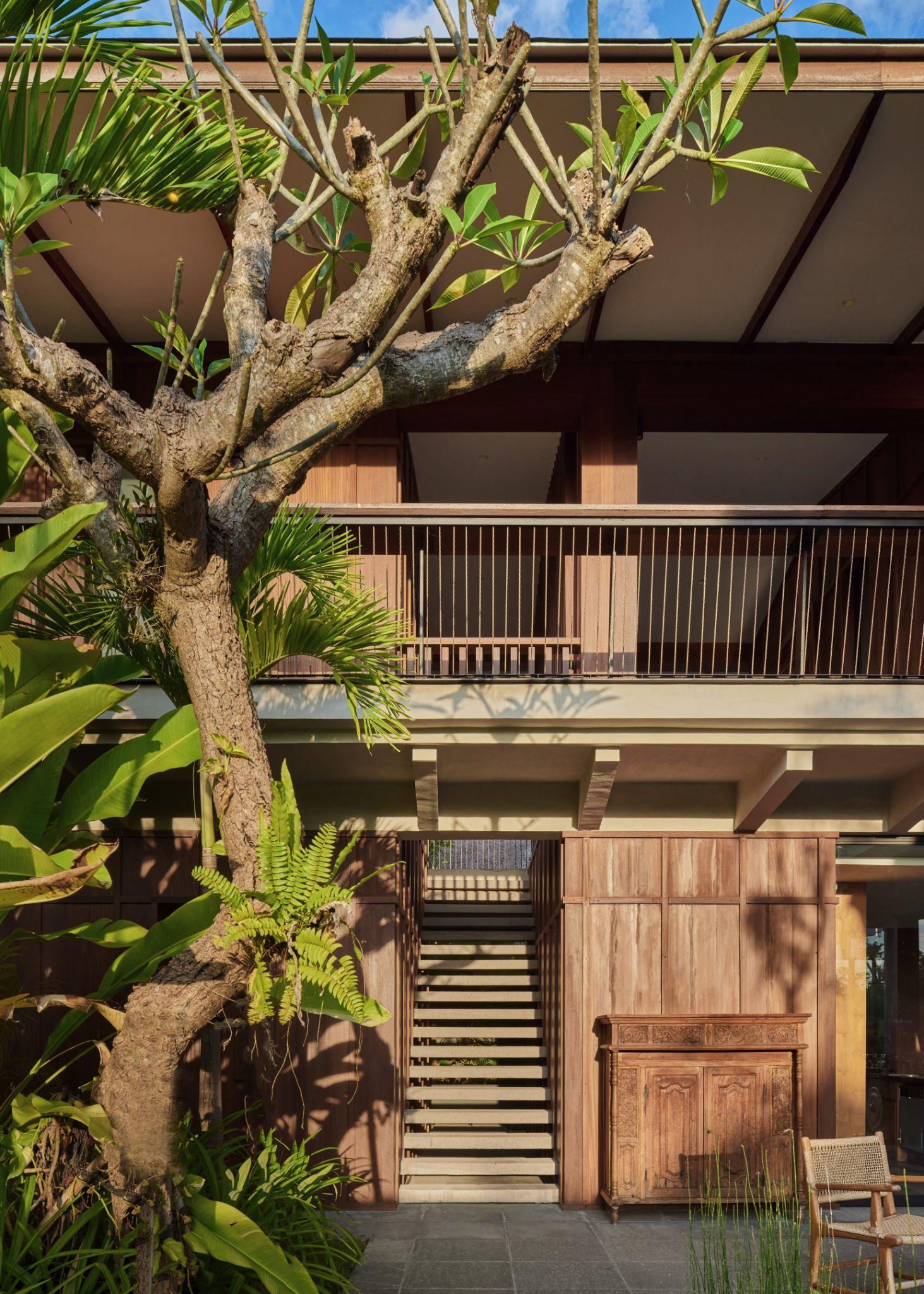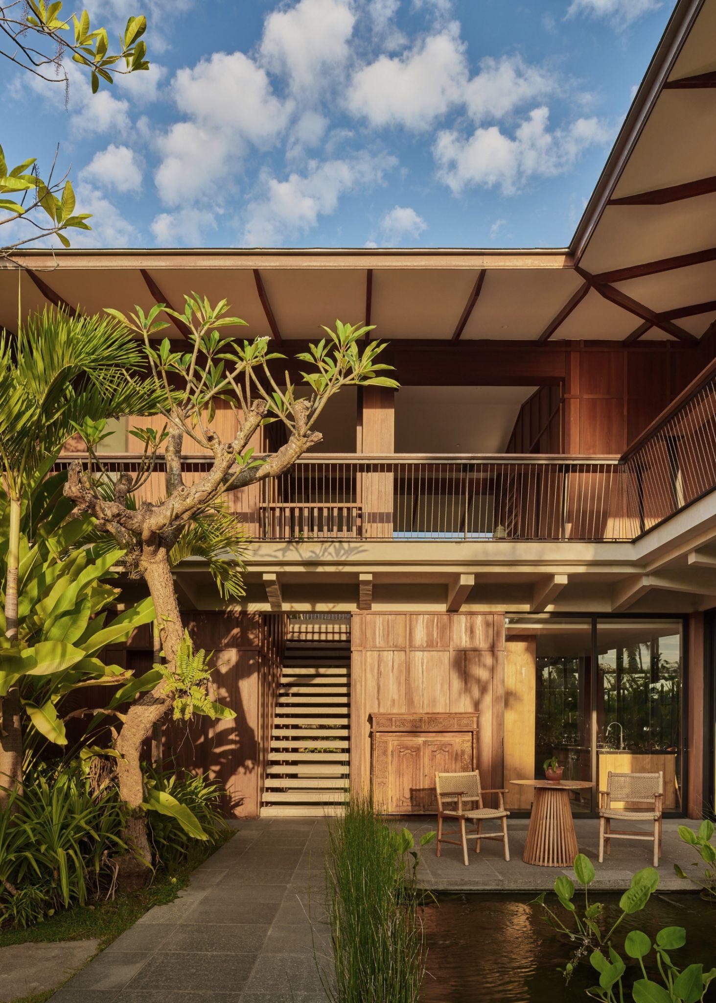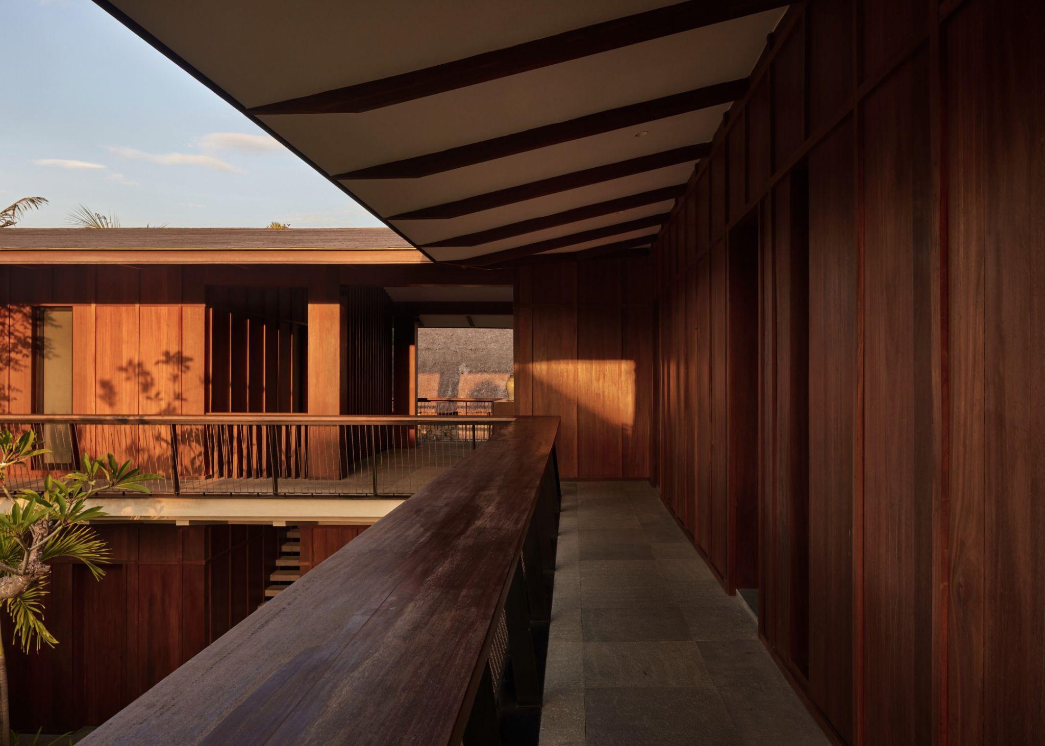 Hệ tường gỗ được thiết kế bằng các tấm lớn ghép mộng thủ công. Chất liệu địa phương mang đến cảm giác gần gũi, tôn vinh truyền thống Bali