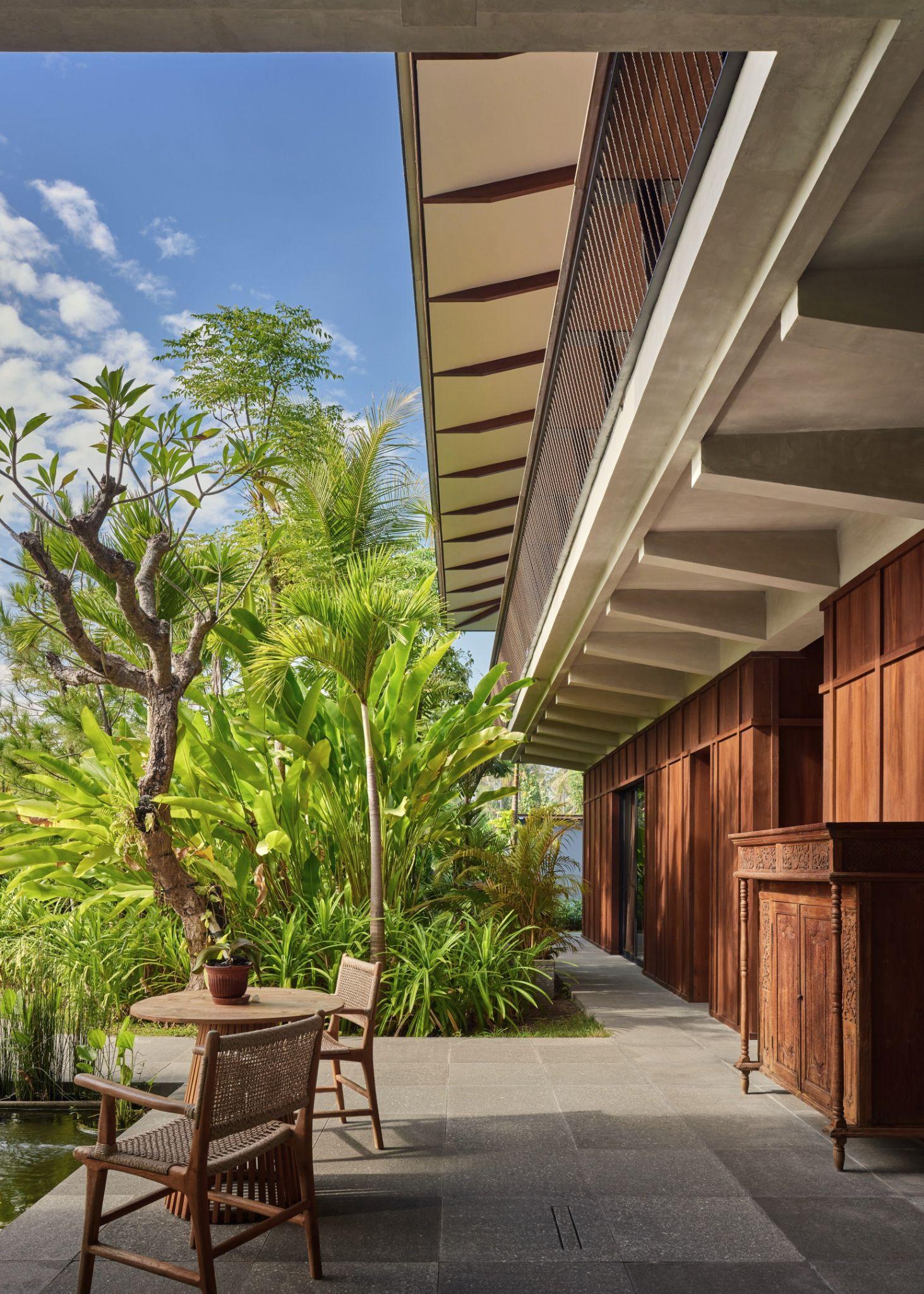 Lối hành lang lát đá nối các phòng với không gian mở bên ngoài. Gió và ánh sáng tràn ngập, mang lại cảm giác thư thái đúng tinh thần Bali