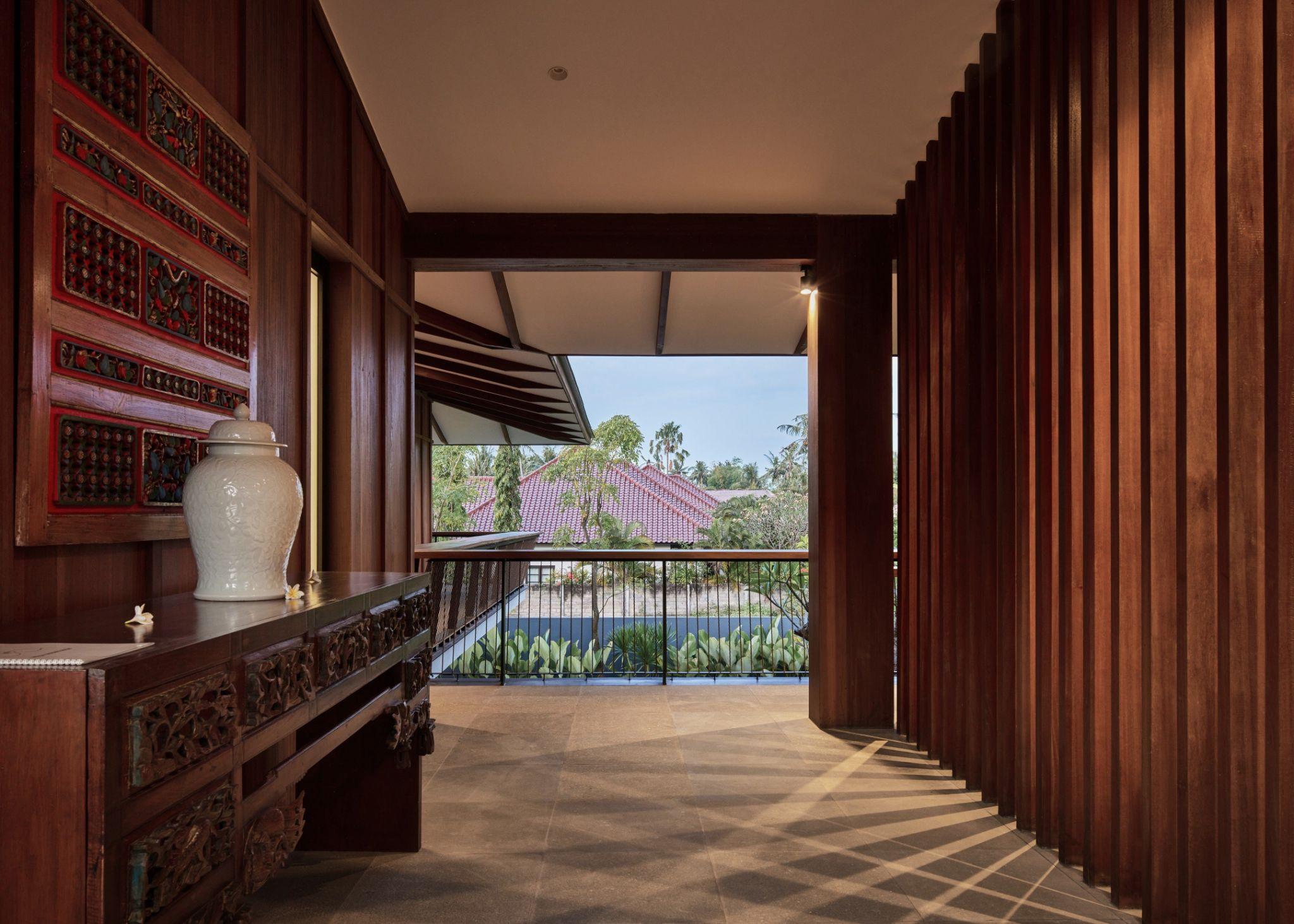 Lối hành lang lát đá và lan can gỗ dẫn đến các phòng ngủ yên tĩnh. Ánh sáng vàng dịu của đèn và hương gỗ tự nhiên mang lại cảm giác an yên sau một ngày dài
