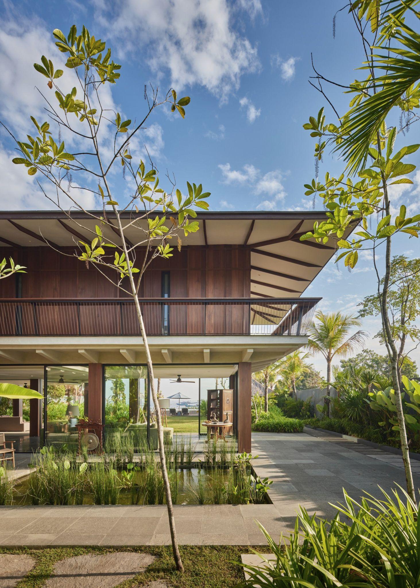 Mặt đứng chính của ngôi nhà 2 tầng nổi bật với hệ mái hiên rộng vươn ra giữa hàng dừa xanh. Tỷ lệ ngang và đường mái bay tạo nên cảm giác nhẹ nhàng đặc trưng của kiến trúc nhiệt đới