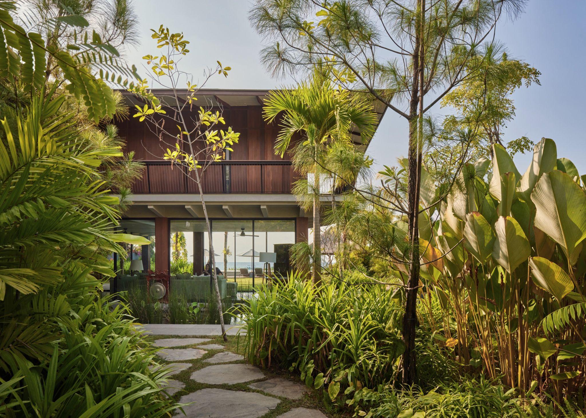 Lối vào được dẫn qua khu vườn rậm rạp và lối lát đá tự nhiên. Mảng xanh bao quanh giúp điều hòa nhiệt độ và kết nối con người với cảnh quan