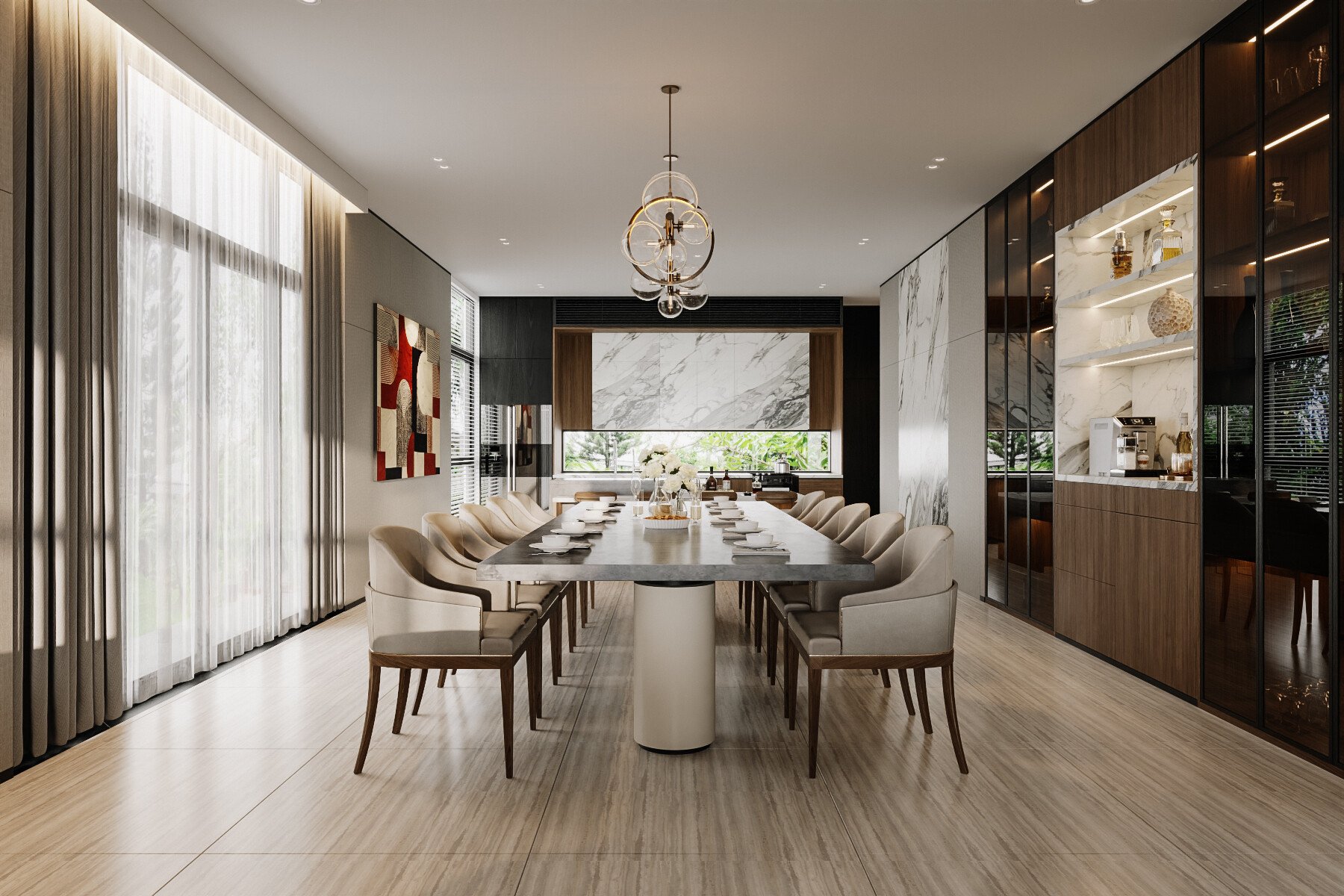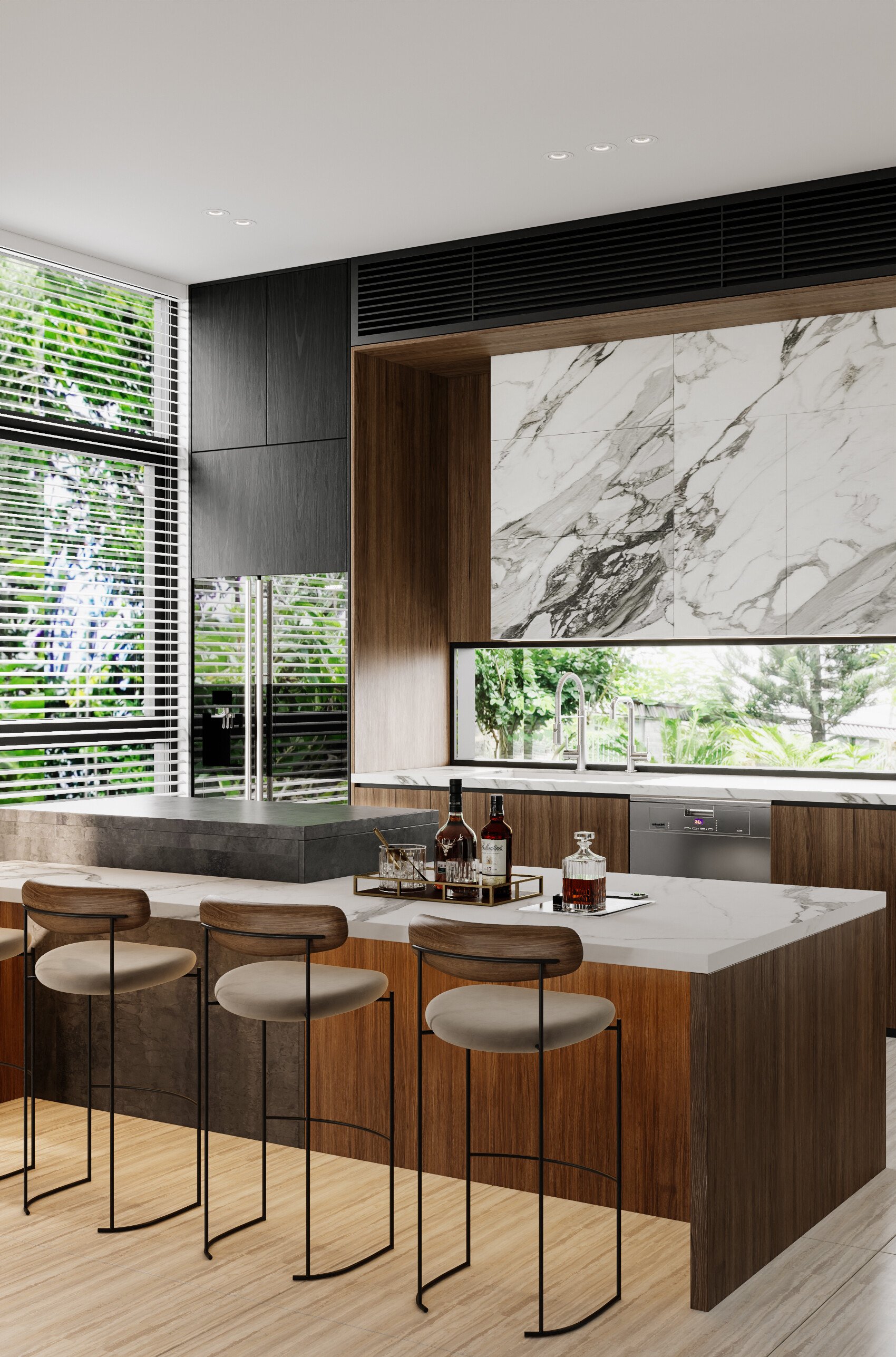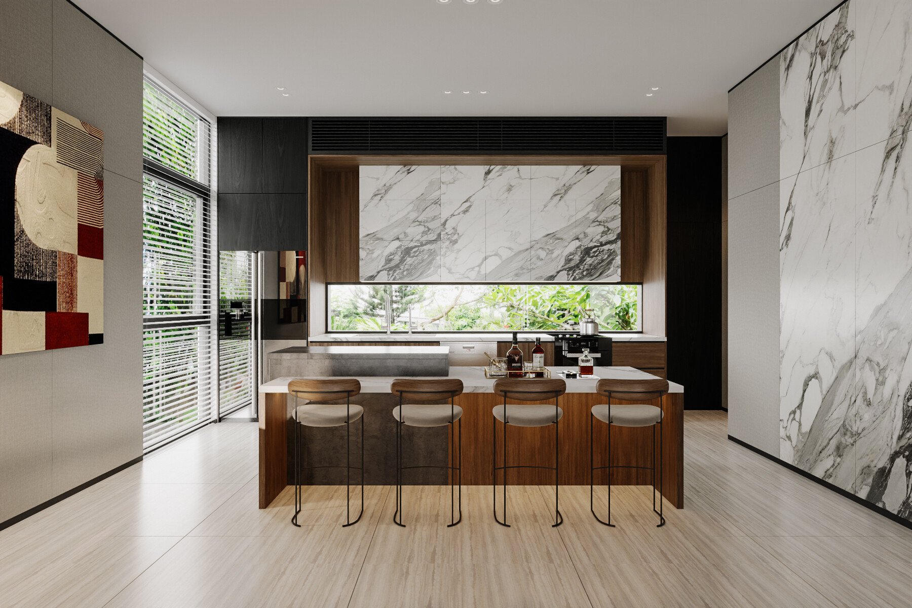 Không chỉ là nơi sinh hoạt chung, phòng khách và phòng bếp của ngôi biệt thự này được 3A Signature kiến tạo như hai nốt nhạc hài hòa trong cùng một bản giao hưởng mang tinh thần Modern Tropical. Sự kết hợp giữa đá marble, gỗ ấm và ánh sáng tự nhiên tạo nên một không gian vừa sang trọng, vừa gần gũi - nơi gia chủ có thể cảm nhận nhịp thở của thiên nhiên trong từng khoảnh khắc thường nhật.