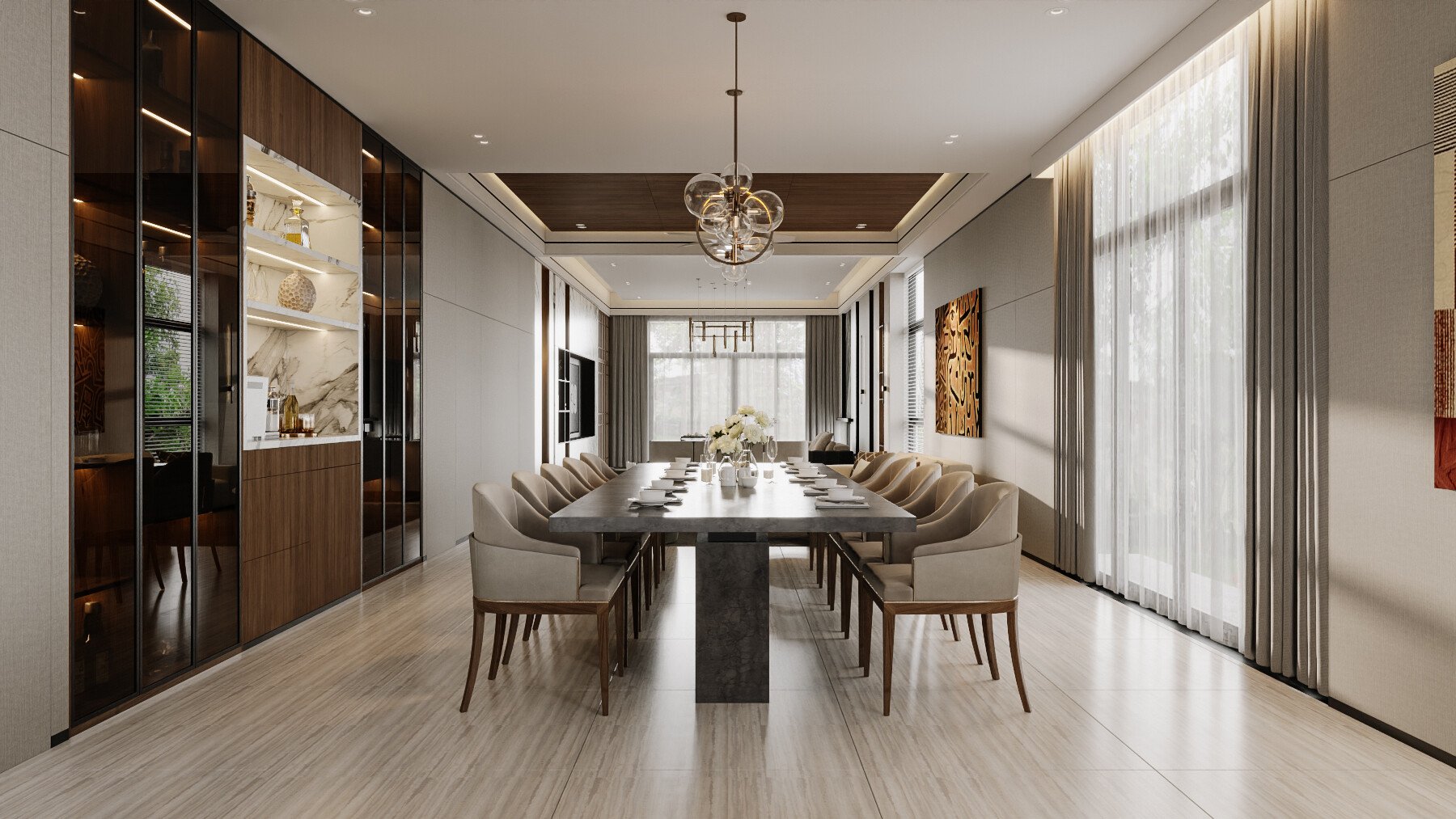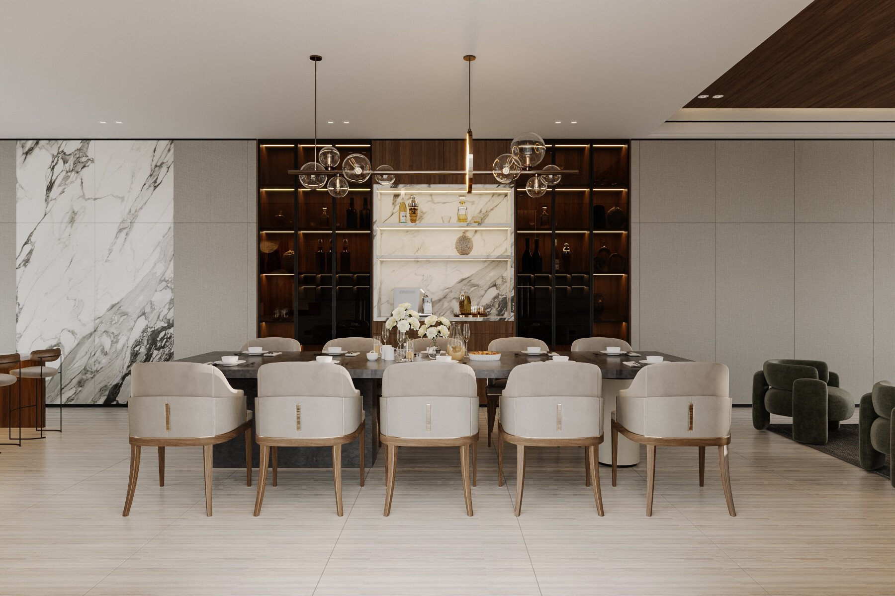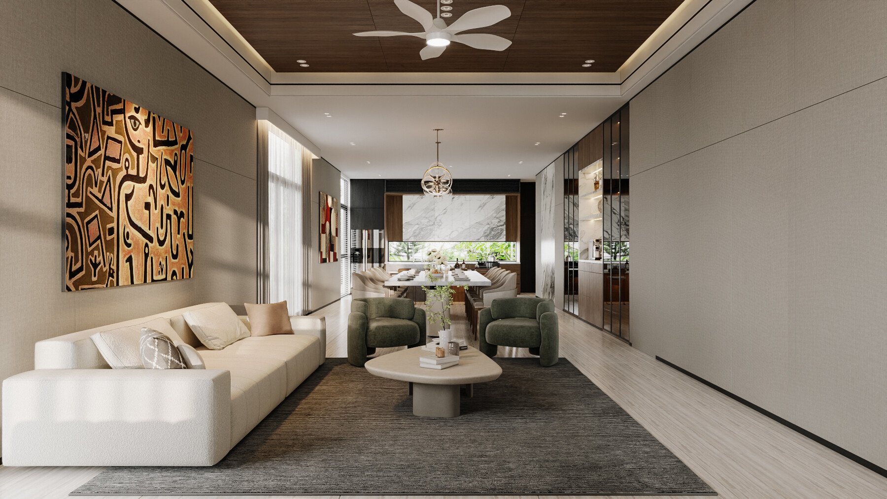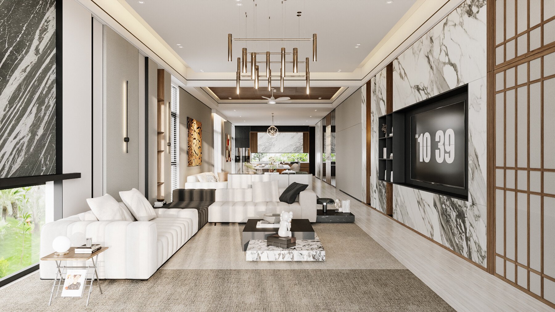 Không chỉ là nơi sinh hoạt chung, phòng khách và phòng bếp của ngôi biệt thự này được 3A Signature kiến tạo như hai nốt nhạc hài hòa trong cùng một bản giao hưởng mang tinh thần Modern Tropical. Sự kết hợp giữa đá marble, gỗ ấm và ánh sáng tự nhiên tạo nên một không gian vừa sang trọng, vừa gần gũi - nơi gia chủ có thể cảm nhận nhịp thở của thiên nhiên trong từng khoảnh khắc thường nhật.
