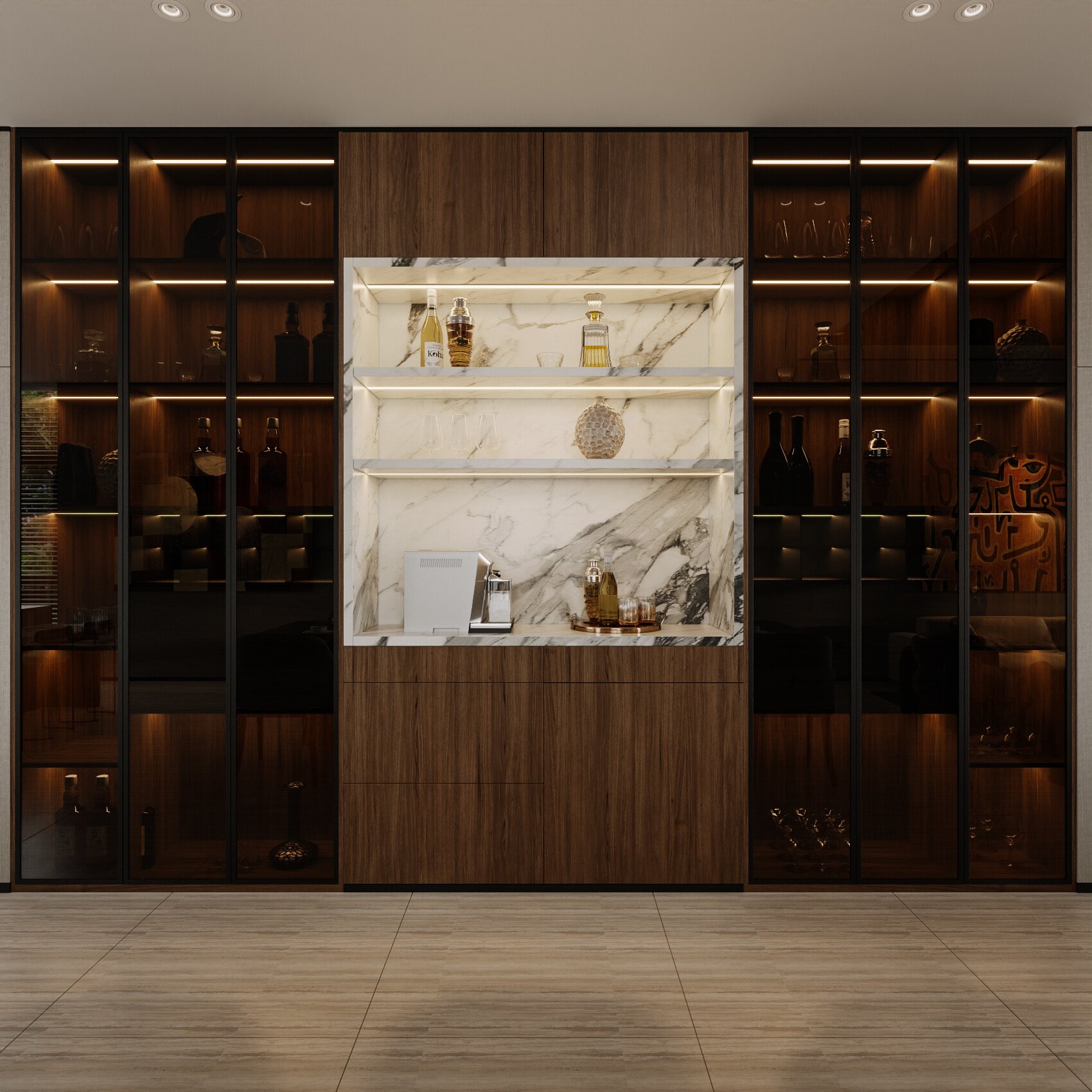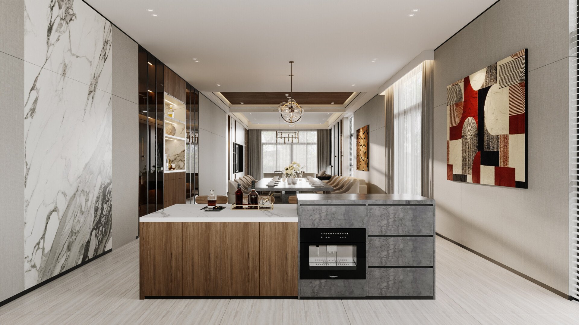 Liền mạch với phòng khách, khu bếp mở ra như một phần tiếp nối của cảm xúc - nơi hơi ấm của ngọn lửa và sự tinh tế của thiết kế cùng hòa quyện. Đảo bếp trung tâm được ốp đá marble vân tự nhiên, vừa là khu vực nấu nướng, vừa là quầy bar nhỏ để trò chuyện và thưởng thức những ly rượu vang nhẹ.