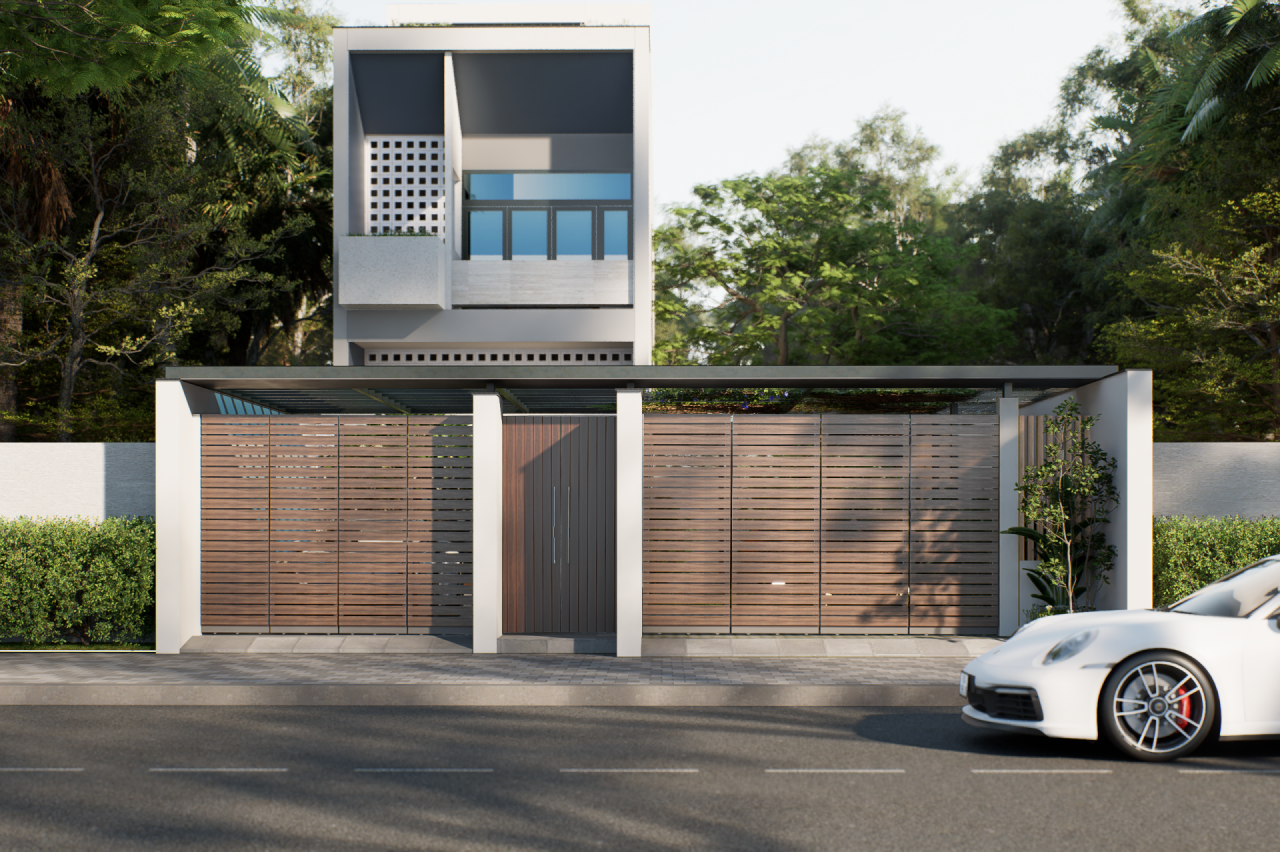 Tường đặc & Vật liệu chắn nắng: Mặt đứng được xử lý bằng các mảng khối đặc, tường dày và bố trí lớp vật liệu chắn nắng như lam che, gạch thông gió hoặc cây xanh. Điều này giúp giảm thiểu tối đa nhiệt lượng truyền trực tiếp vào nhà.