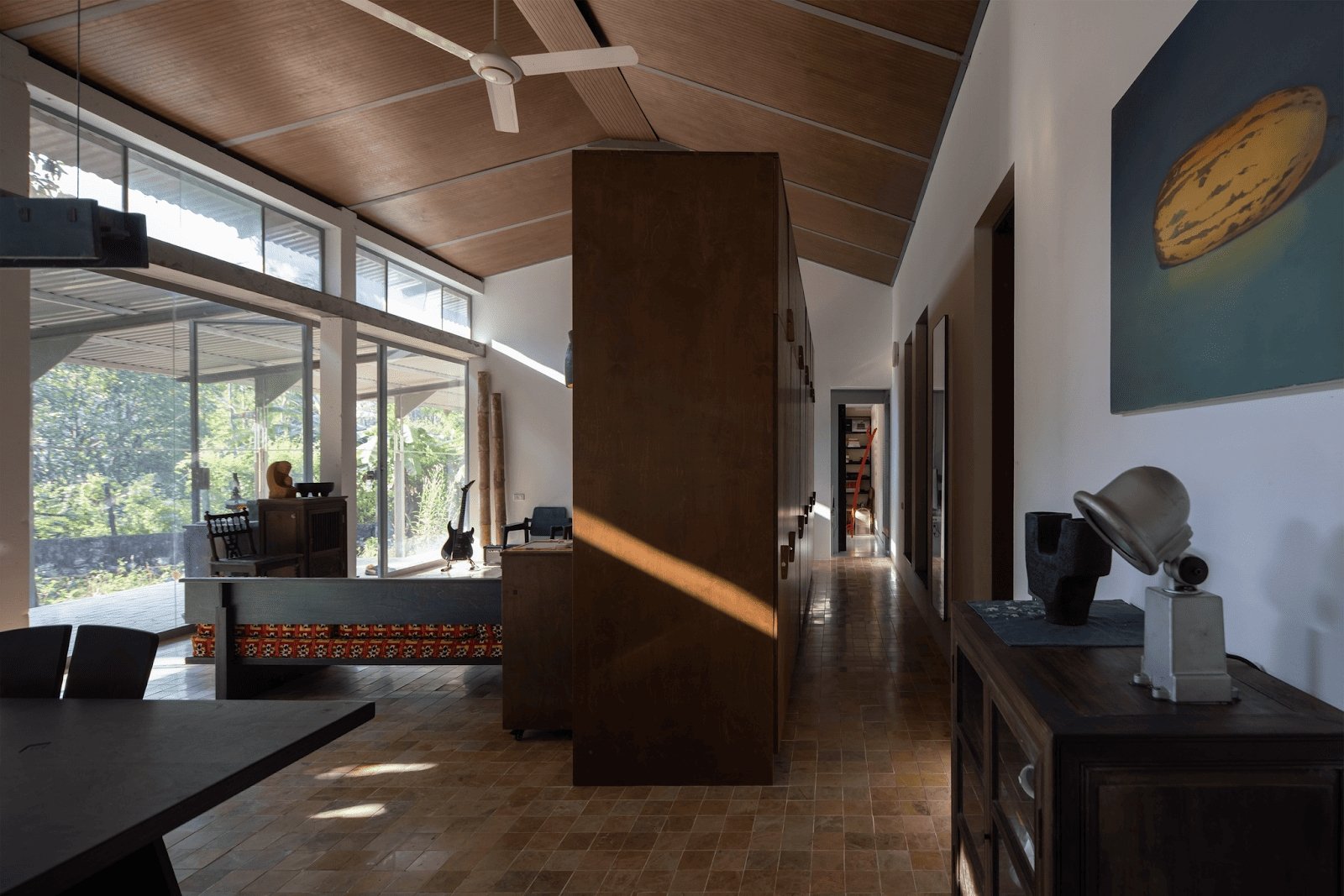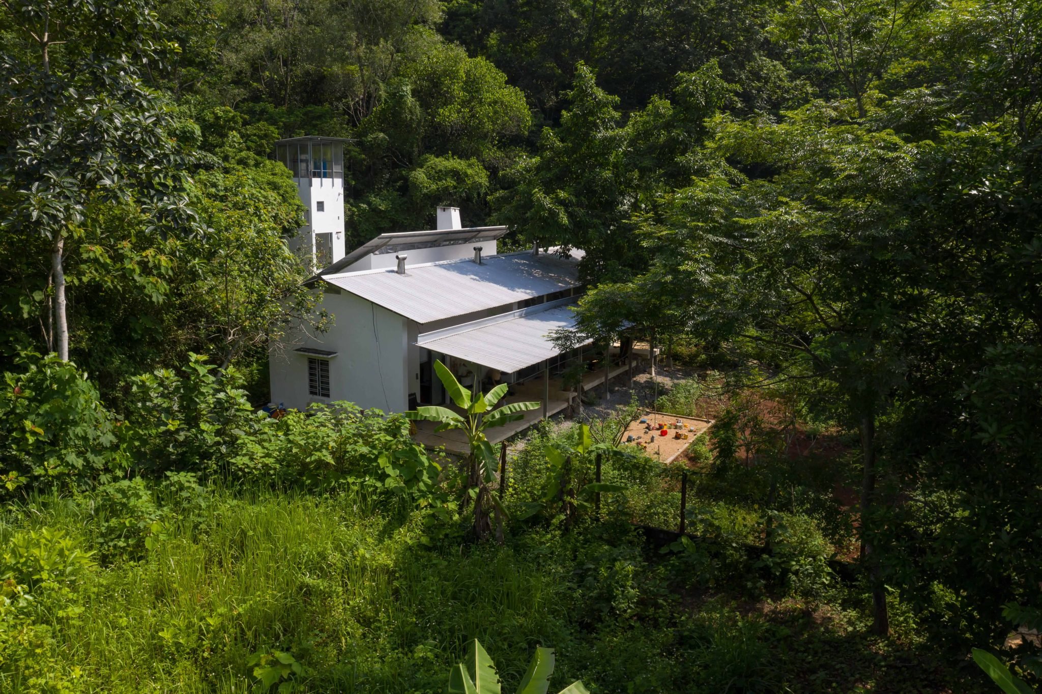 Mỗi khối nhà đều có diện tích vừa phải, tránh tác động mạnh vào địa hình tự nhiên. Không gian chính đặt dưới tán cây lớn, các phần phụ như bể nước, phòng vẽ, nhà kho… được bố trí thành cụm, kết nối bằng hàng hiên rộng rãi.