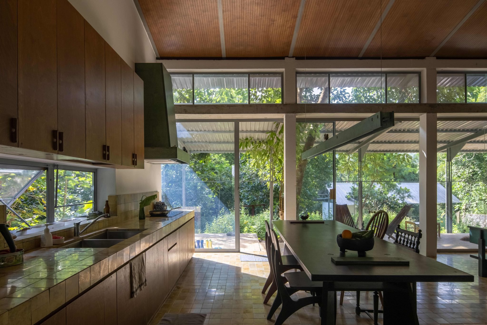 Khu bếp và bàn ăn đón ánh sáng từ ba phía, mở ra thiên nhiên