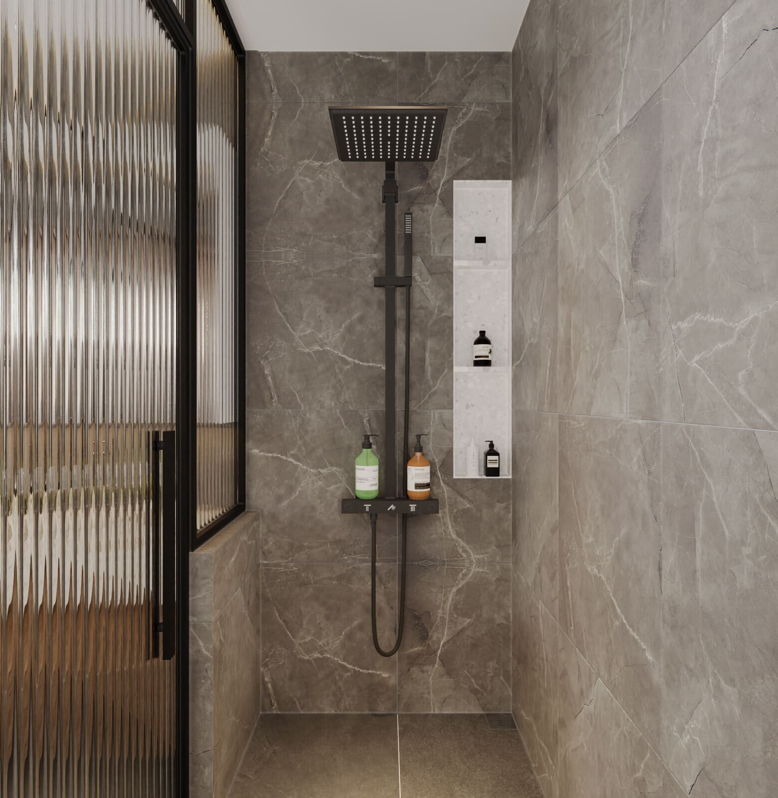 Khu vực tắm đứng với vòi sen đen mờ hiện đại, sự tối giản đầy tính nghỉ dưỡng.