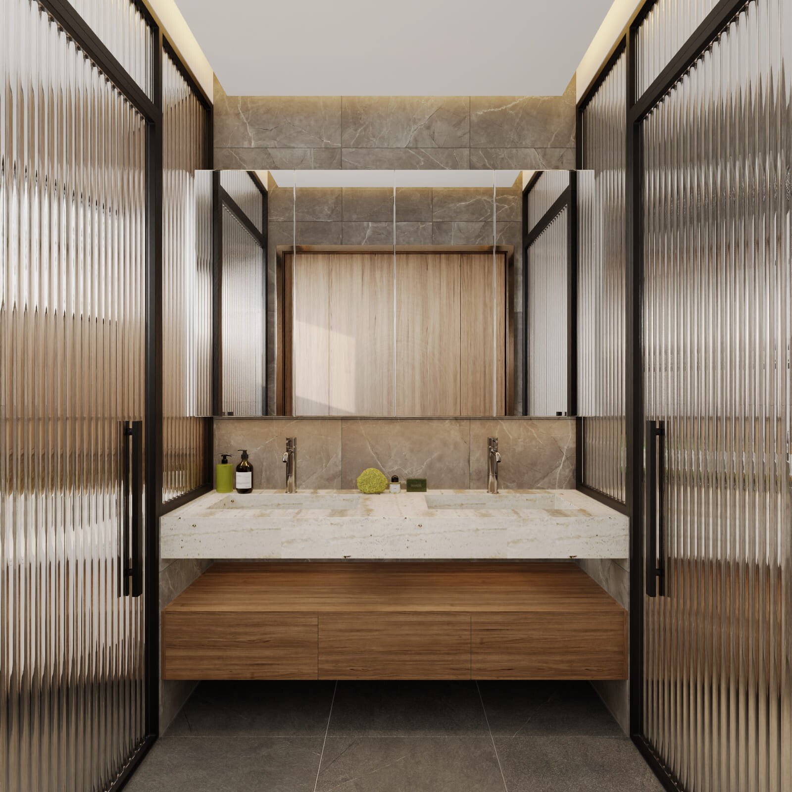 Lavabo đôi với mặt đá nhạt, kết hợp tủ gỗ nổi - điểm nhấn tiện nghi và thẩm mỹ.