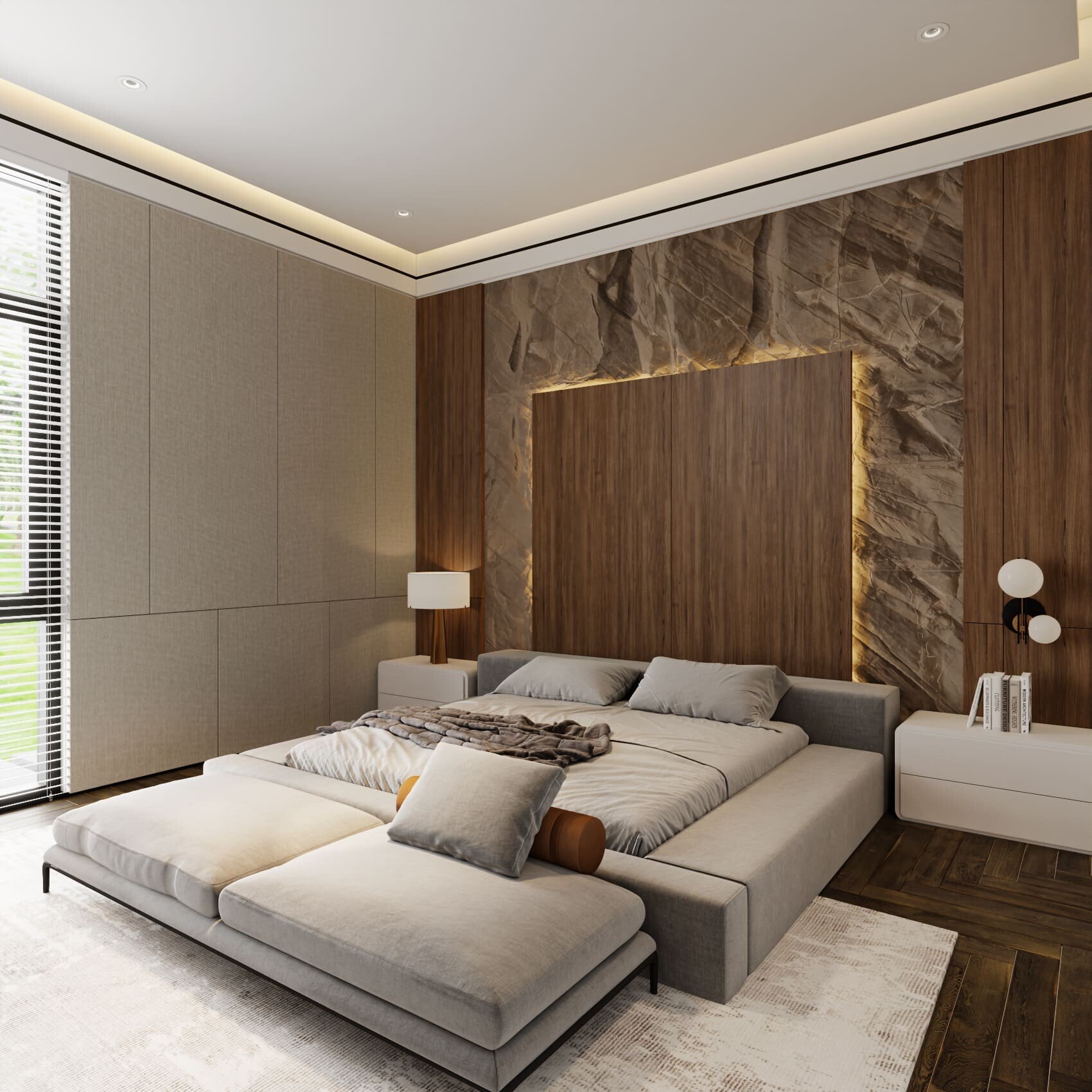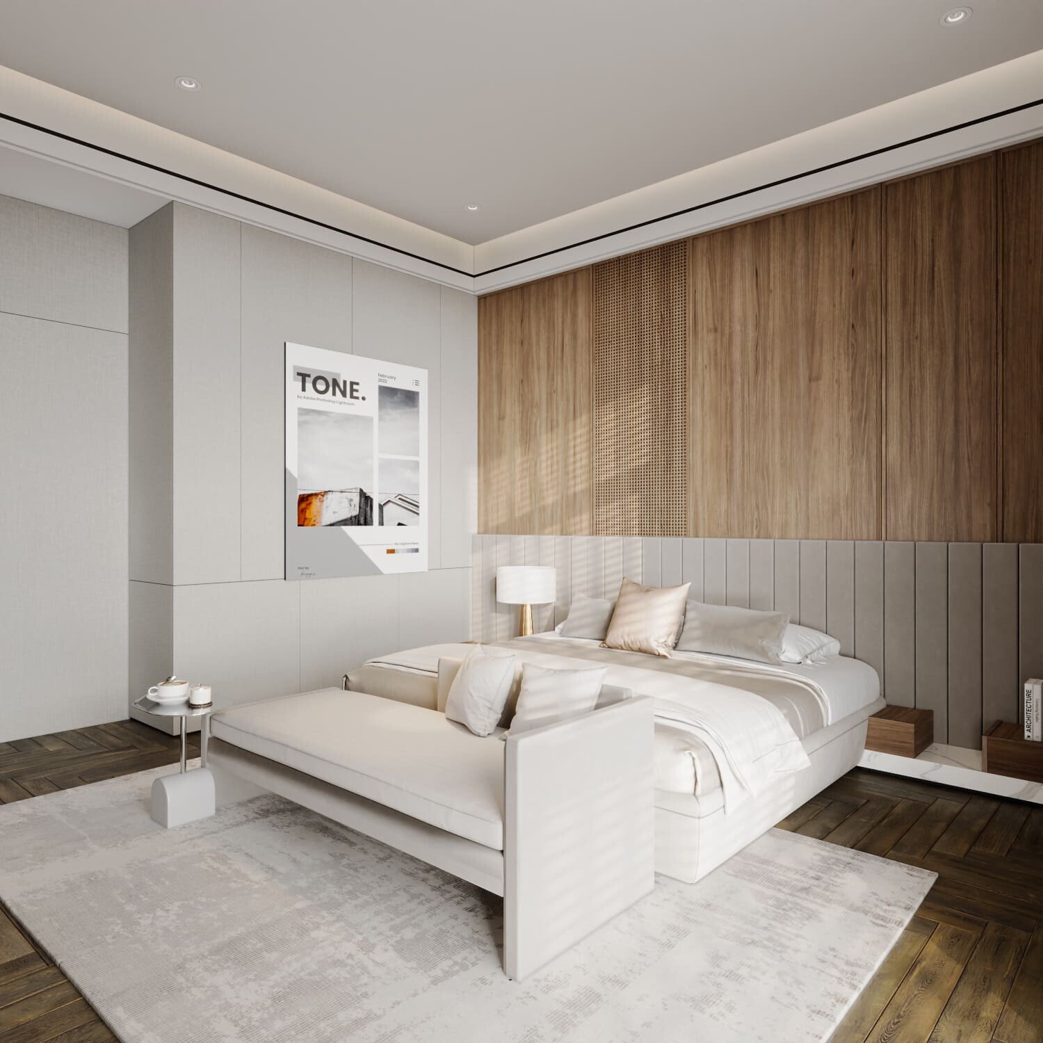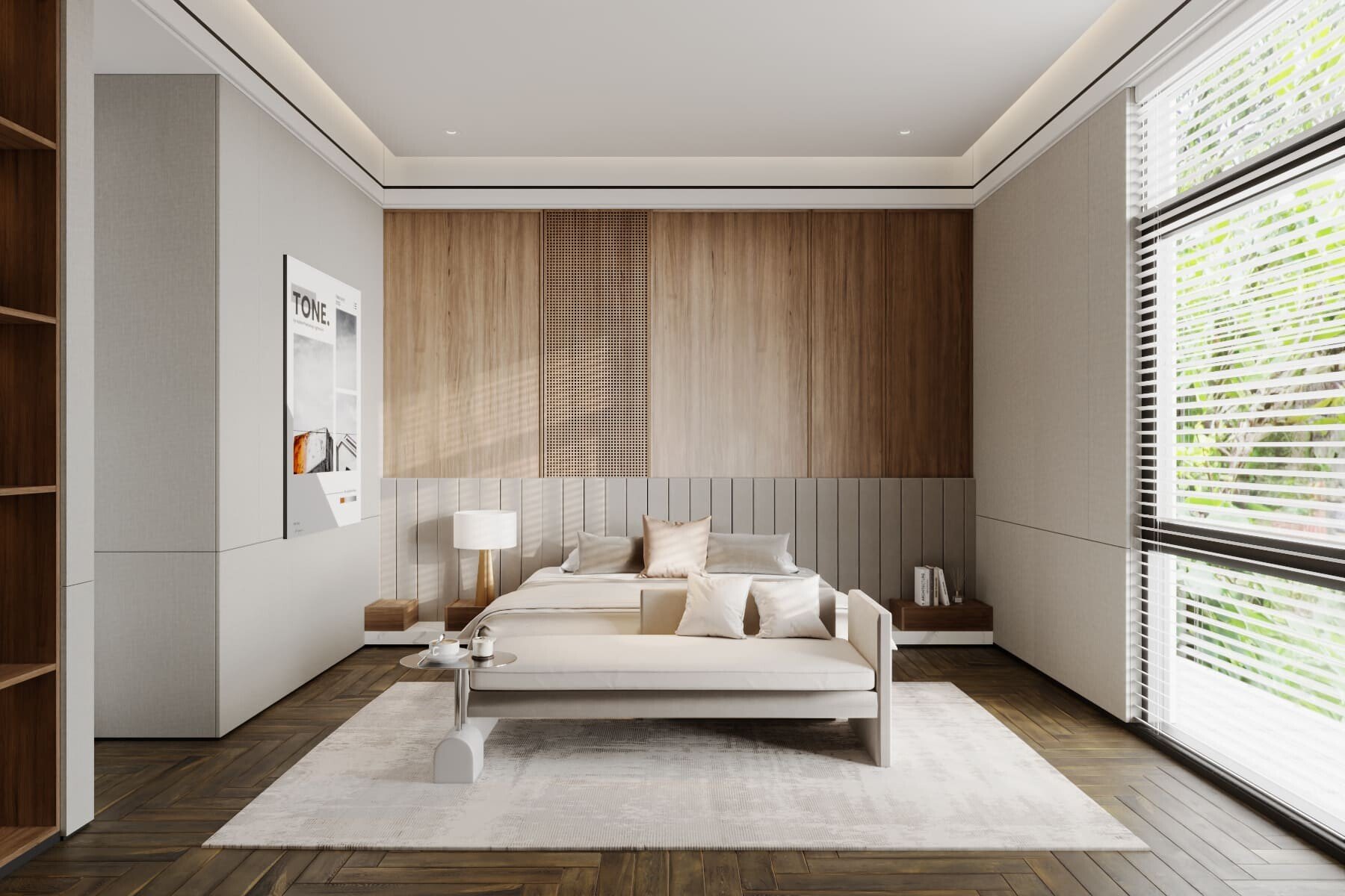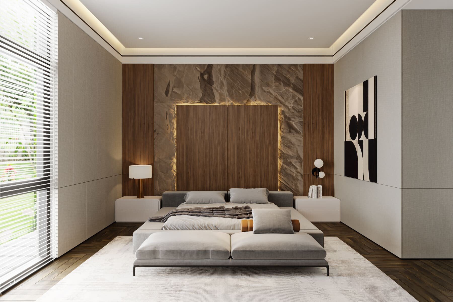 Không gian phòng ngủ mang tinh thần tối giản, sang trọng và ấm áp.