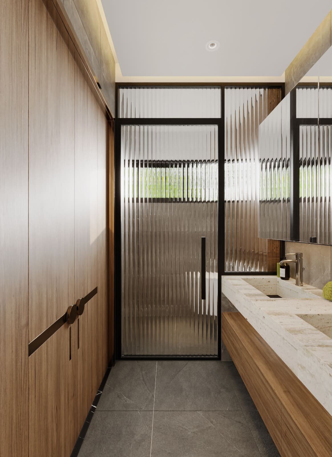 Hệ vách kính mờ dọc tạo hiệu ứng ánh sáng mềm, tăng sự riêng tư mà không bí bách.