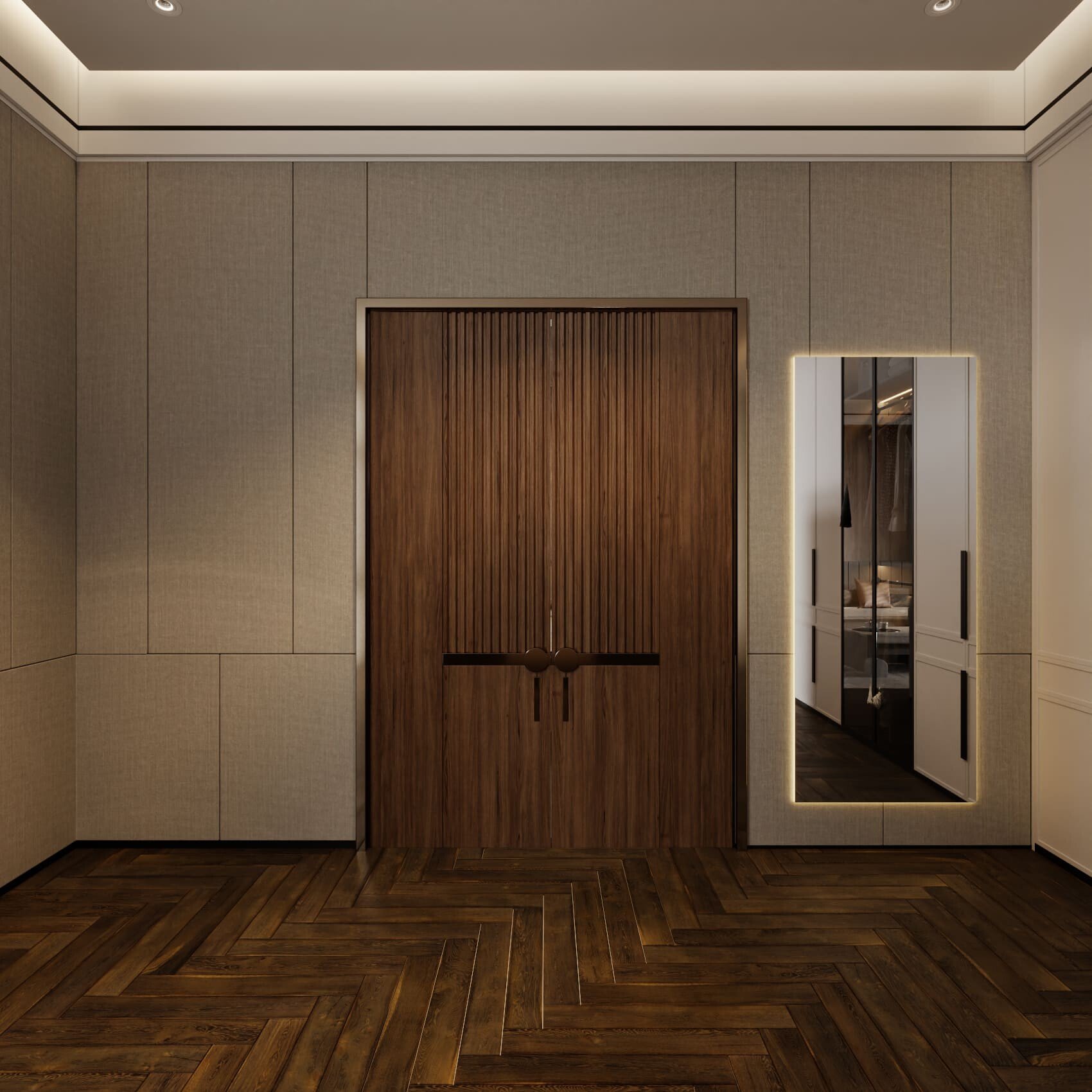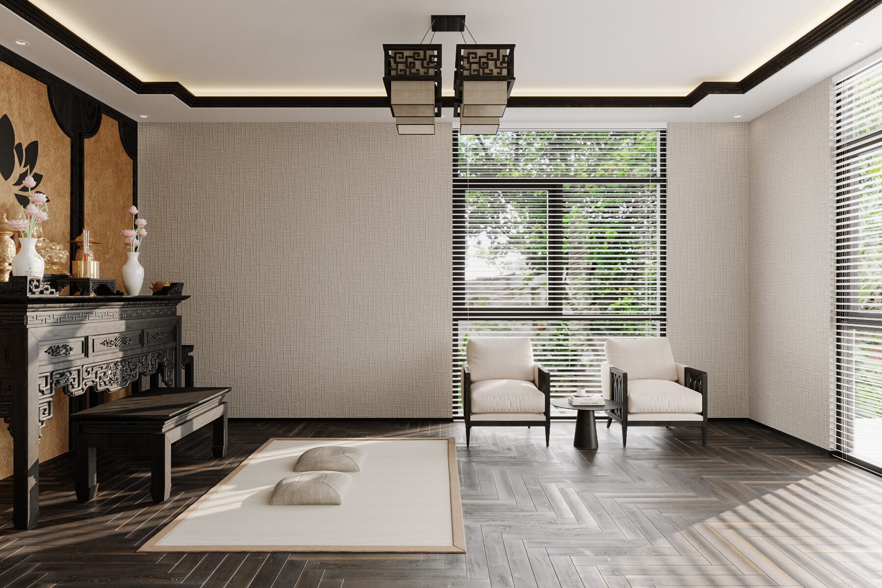 Mảng tường trung tâm nhấn bằng chất liệu cao cấp và họa tiết hoa sen – biểu tượng thuần khiết và bình an giúp không gian vừa ấm cúng vừa linh thiêng. Mỗi chi tiết đều được tiết chế, để gia chủ có thể an tĩnh, chiêm nghiệm và kết nối sâu sắc với giá trị của gia đình.