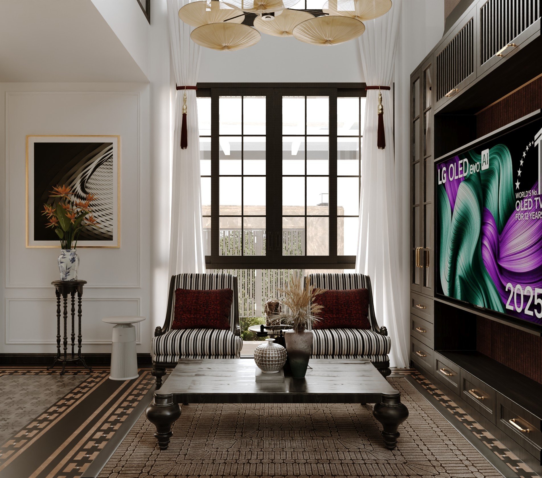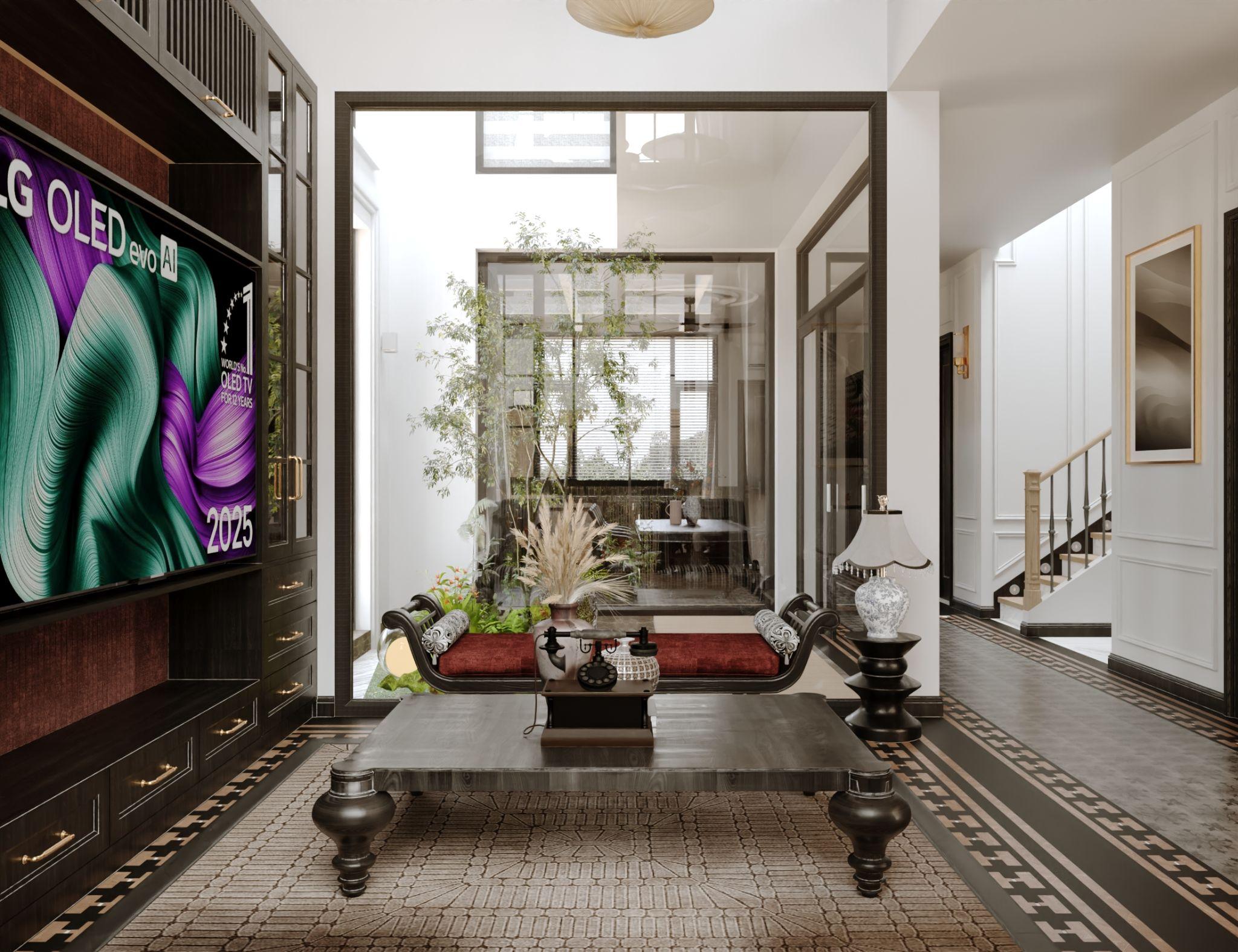 Lấy cảm hứng từ phong cách Indochine kết hợp hài hòa giữa bản sắc Á Đông và hơi thở Pháp cổ, ngôi nhà phố được thiết kế với chất liệu gỗ, mây tre, gạch bông và màu vàng kem chủ đạo, tạo nên một tổng thể sang trọng, nền nã. Tuy nhiên, không gian ấy không hề tách rời hiện đại, nhờ sự xuất hiện khéo léo của các thiết bị LG được tích hợp tinh tế để nâng tầm trải nghiệm sống nhưng vẫn giữ trọn bản sắc kiến trúc.