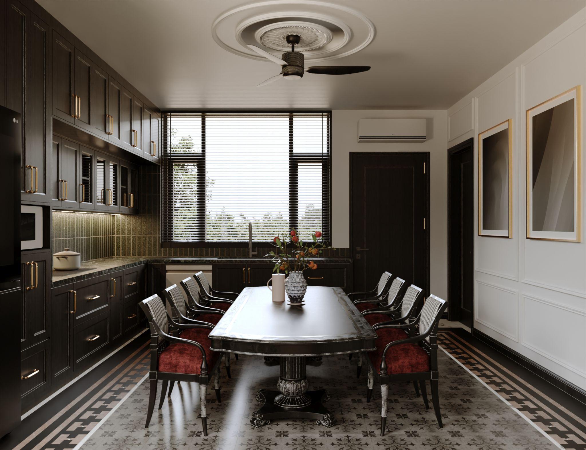 Bước vào khu vực bếp - ăn, không gian mở ra với hệ tủ gỗ sang trọng, ánh sáng tự nhiên ngập tràn qua khung cửa lớn. Ở đây, các thiết bị LG được bố trí hợp lý để không phá vỡ nhịp điệu thiết kế: Tủ lạnh LG Instaview Door-in-door màu đen tạo điểm nhấn hiện đại đầy sang trọng.