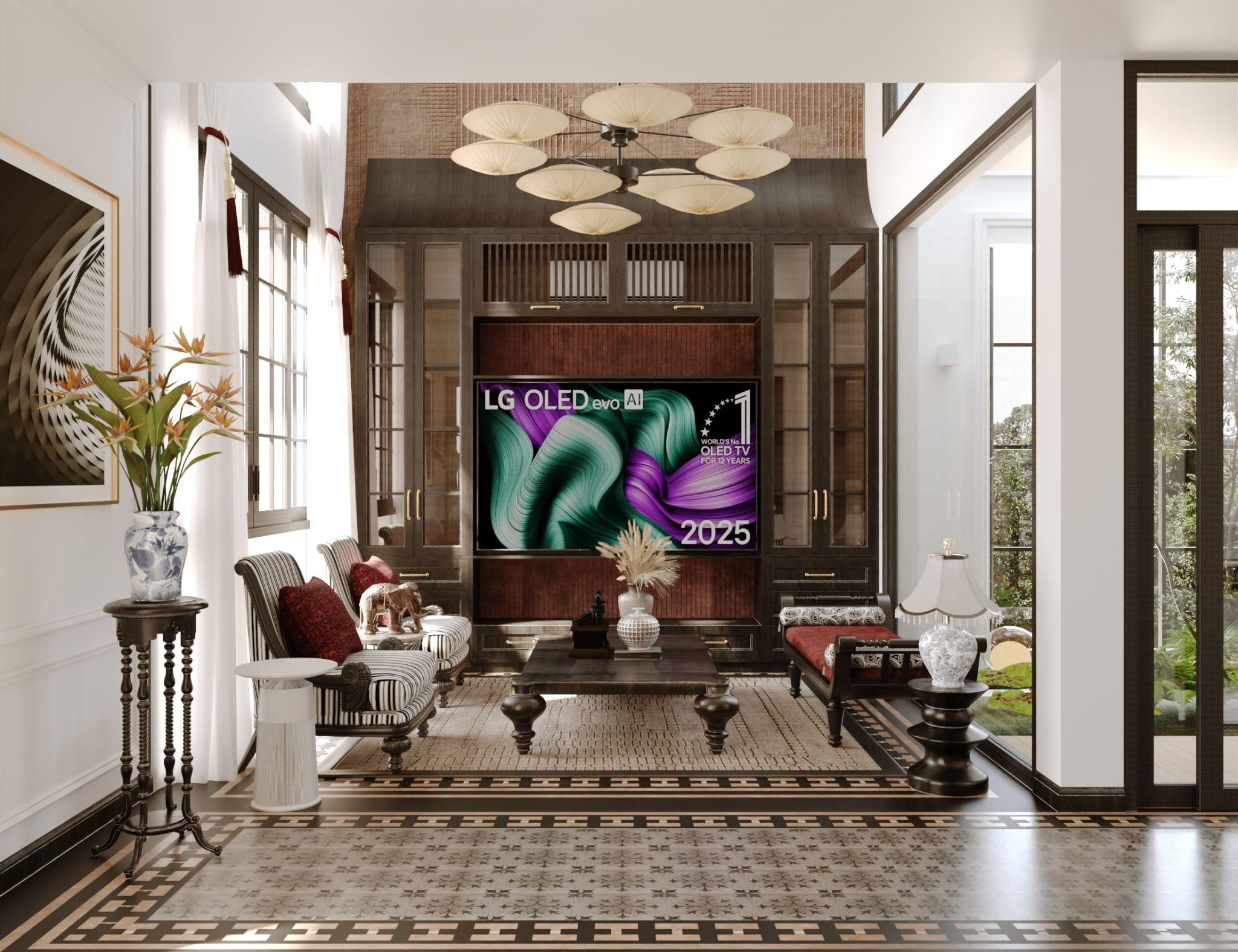 Phòng khách là trung tâm kết nối, gợi nhớ về không khí cổ điển nhưng được làm mới bằng hệ tủ gỗ cao kịch trần, bàn ghế chạm khắc và đặc biệt là chiếc LG OLED M5 - dòng TV mỏng nhẹ nhưng mang đến hình ảnh sắc nét sống động như thật. Khi không sử dụng, TV như chìm vào bức vách gỗ, trở thành một phần của nội thất tổng thể.