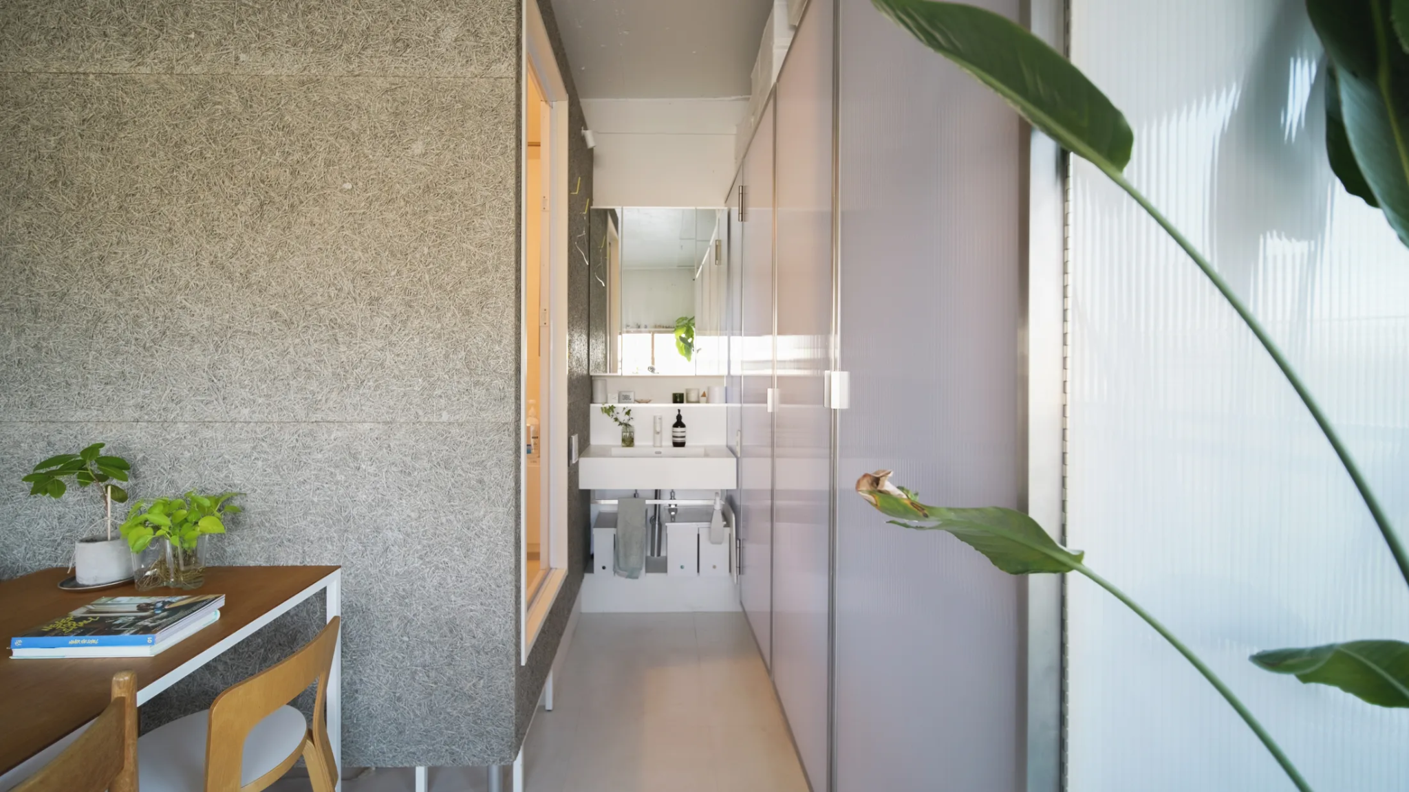 Đối diện với phòng tắm là hệ tủ lưu trữ với cửa trượt acrylic mờ, nơi đặt máy giặt và tủ lạnh nhưng vẫn cho phép ánh sáng nhẹ nhàng len lỏi qua