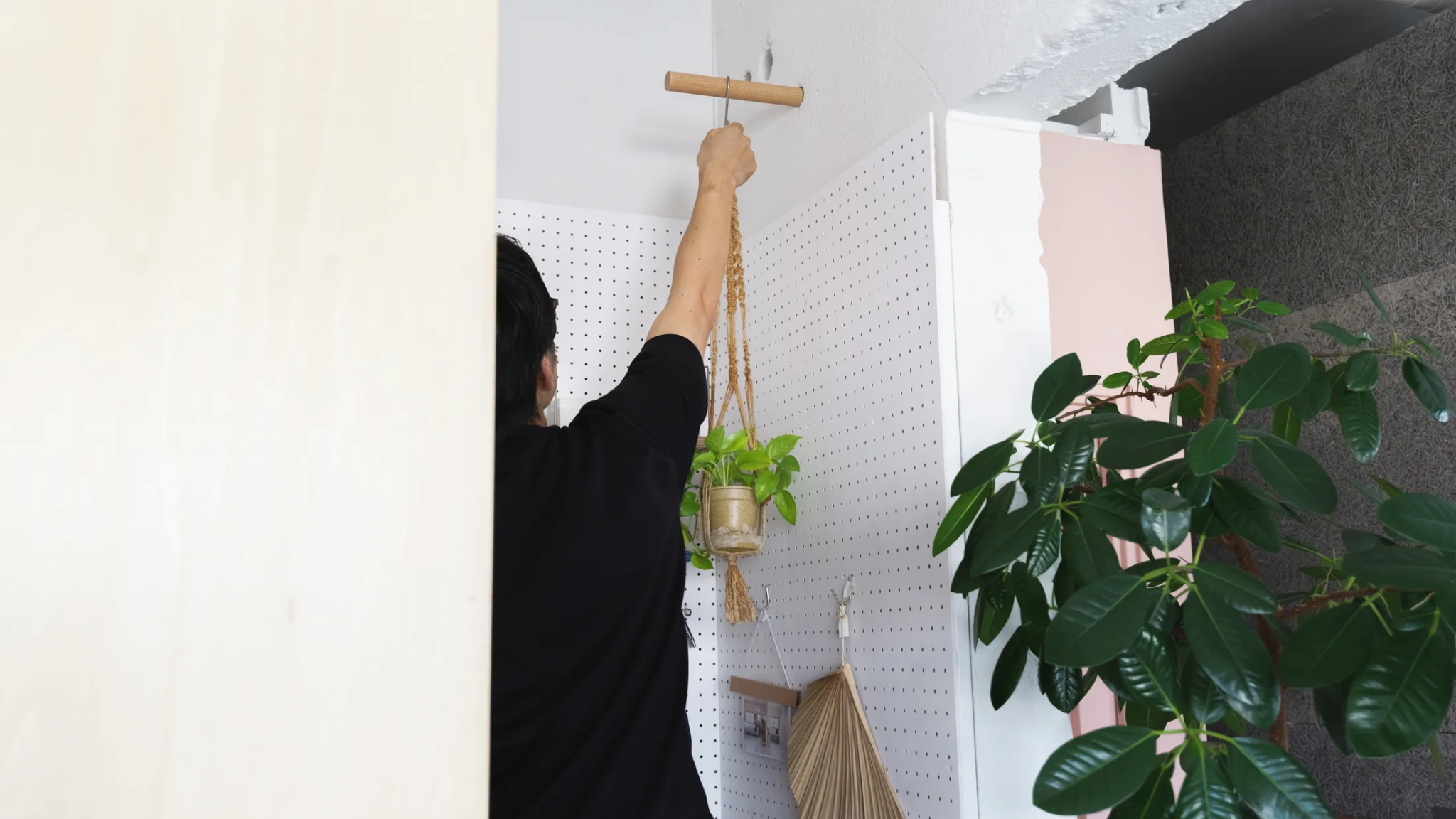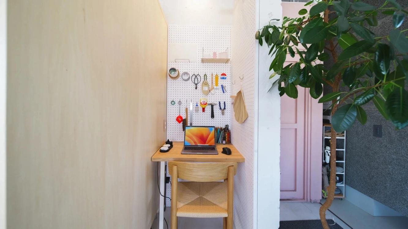 Tinh thần DIY lan tỏa khắp căn hộ, một góc làm việc nhỏ gọn được bố trí hoàn hảo vào khoảng trống giữa tủ quần áo và bức tường. Những chi tiết khác như bức tường pegboard, kệ giày Tower của Yamazaki được tùy chỉnh thêm một tấm gỗ, hay hệ kệ sách lớn được họ tự cắt và hoàn thiện đều cho thấy sự chăm chút tỉ mỉ và tình yêu mà họ dành cho không gian sống đang liên tục thay đổi mỗi ngày.