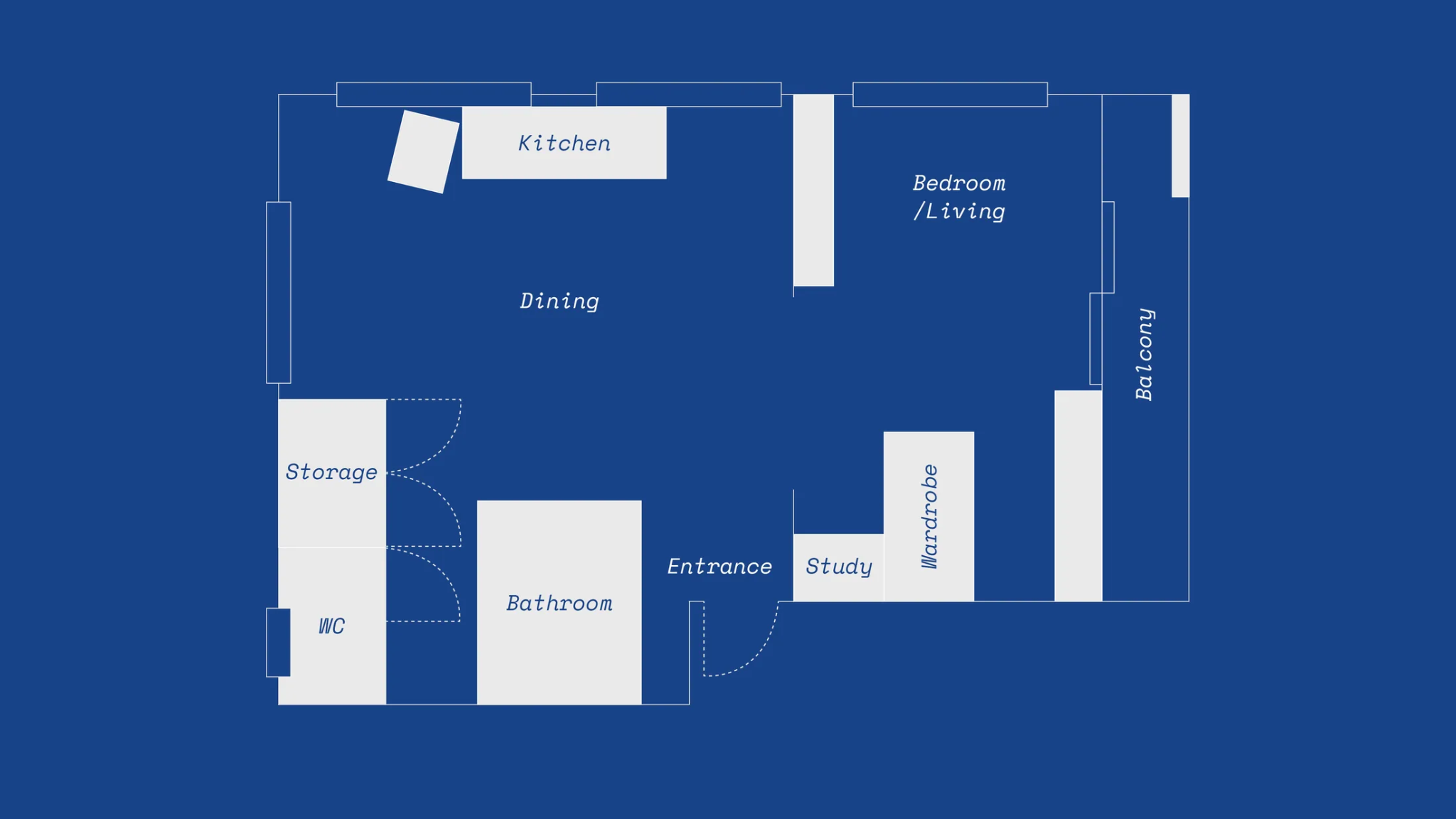 Sau khi phá bỏ sơ đồ cũ, hai vợ chồng đã thả vào không gian sáu khối hộp độc lập được thiết kế riêng tạo nên cấu trúc mới cho căn hộ. Chúng chứa đựng mọi chức năng cốt lõi của căn nhà: phòng tắm, toilet, máy giặt, tủ lạnh, tủ quần áo và bếp được sắp đặt một cách chiến lược.