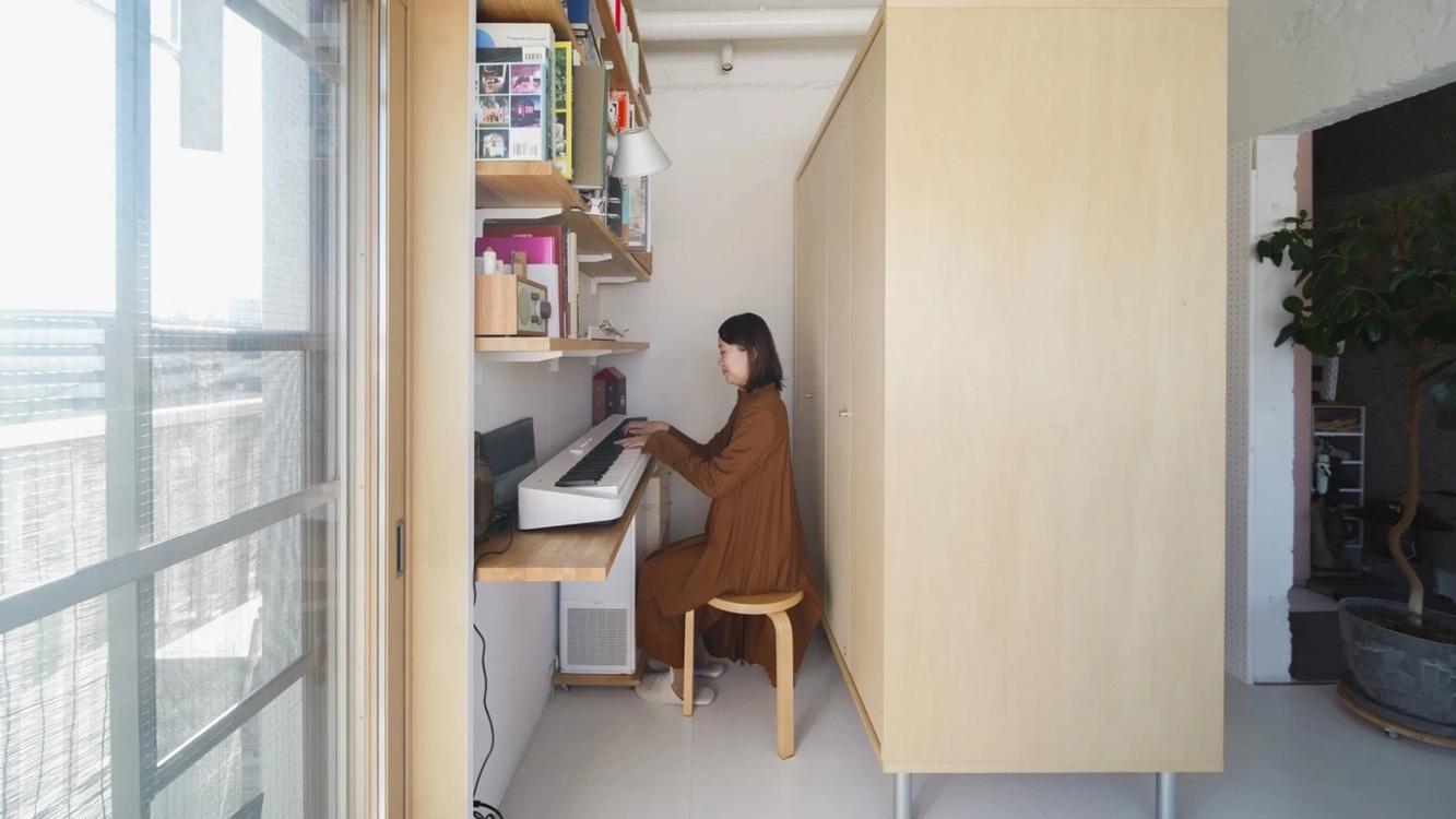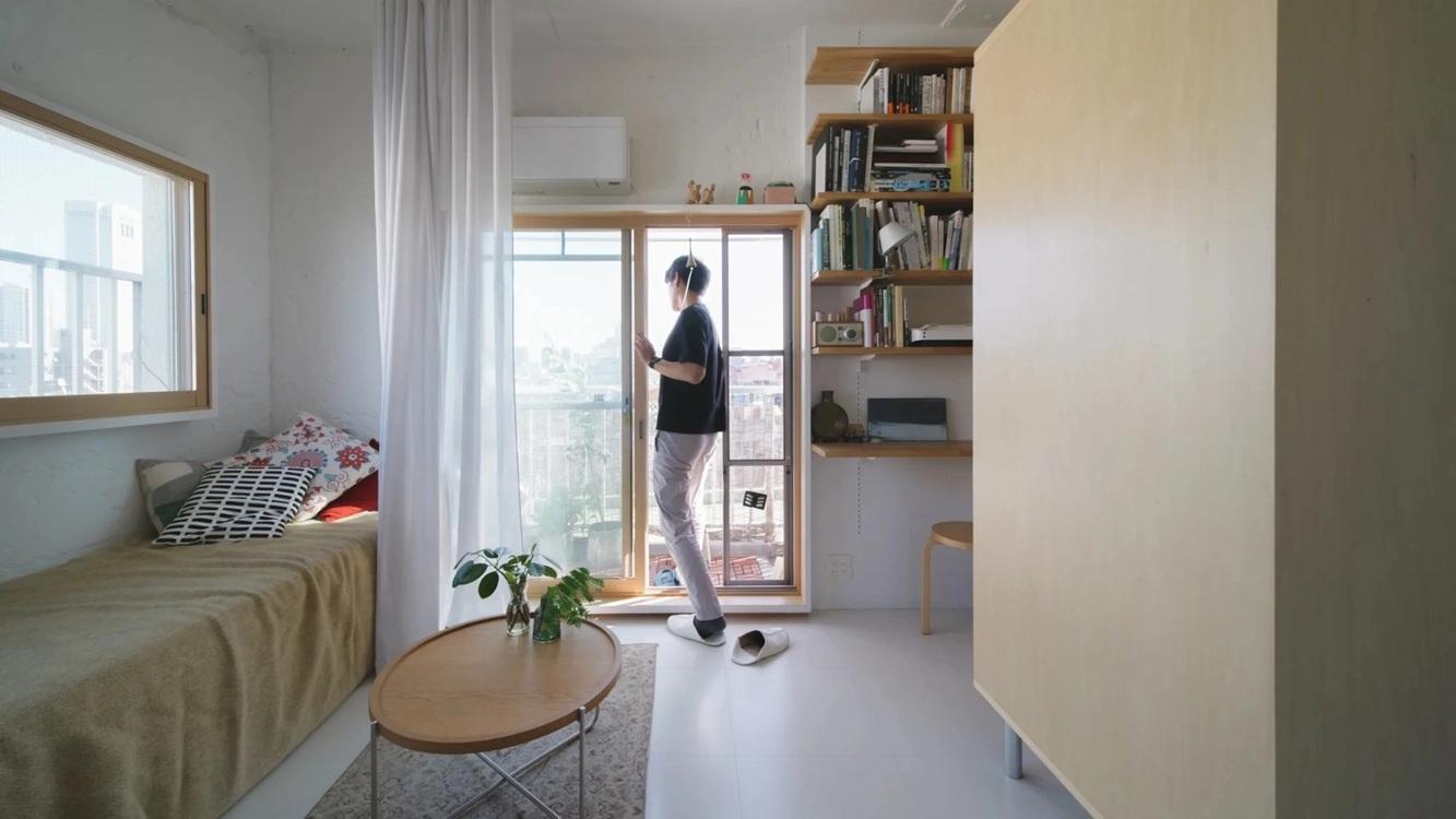 Ban công nhỏ với tầm nhìn ra thành phố đóng là không gian chuyển tiếp, kết nối tổ ấm 35m2 với bối cảnh đô thị Tokyo