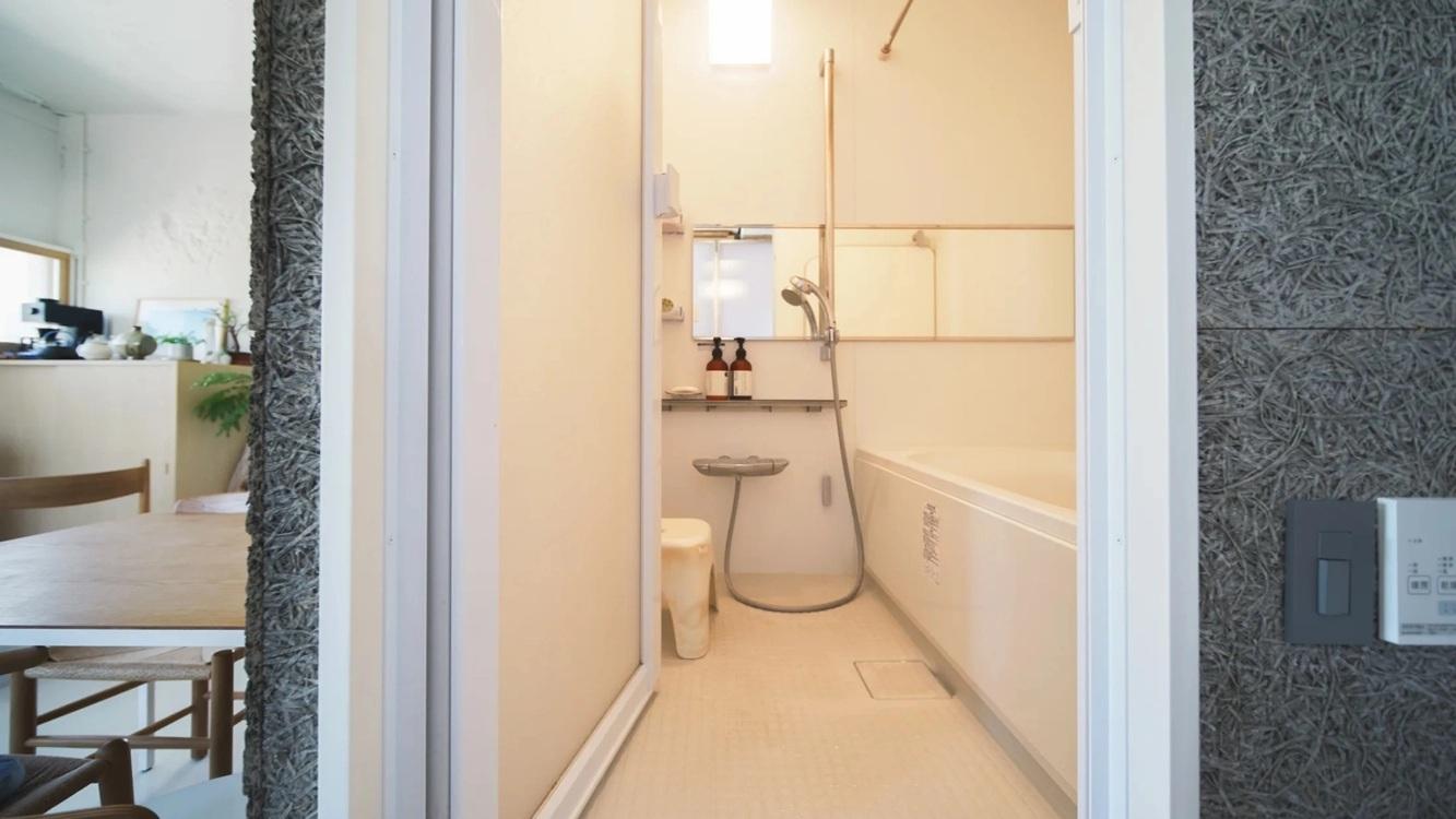 Để giải phóng mặt bằng, các KTS đã gom toàn bộ phòng chung chức năng (phòng tắm, toilet, máy giặt) vào một khối độc lập. Tự thân khối module này trở thành một vách ngăn đa diện, có vai trò phân định không gian và điều hướng lối đi một cách tự nhiên. Bên trong là dạng phòng tắm đúc sẵn đặc trưng của Nhật.