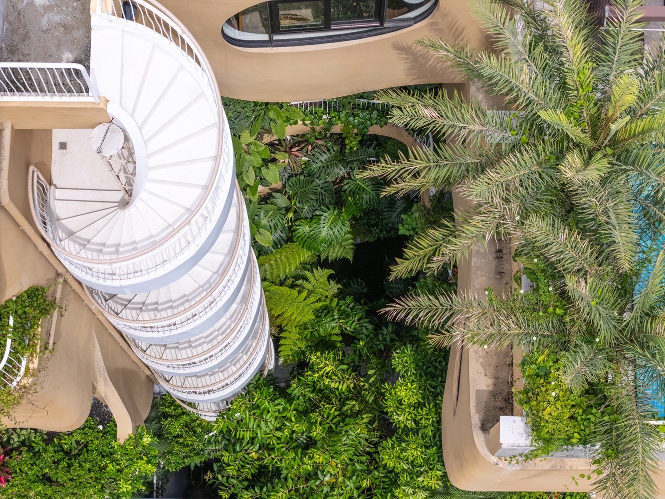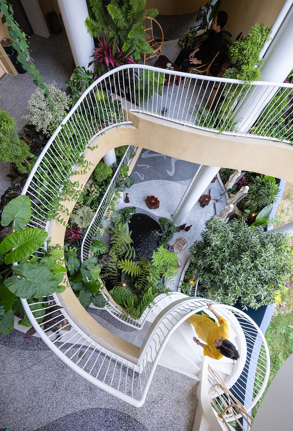 Cầu thang xoắn trắng mềm mại len giữa mảng xanh tầng tầng lớp lớp, tạo nên trục chuyển tiếp dọc vừa hữu dụng vừa thi vị như một khu vườn treo sống động