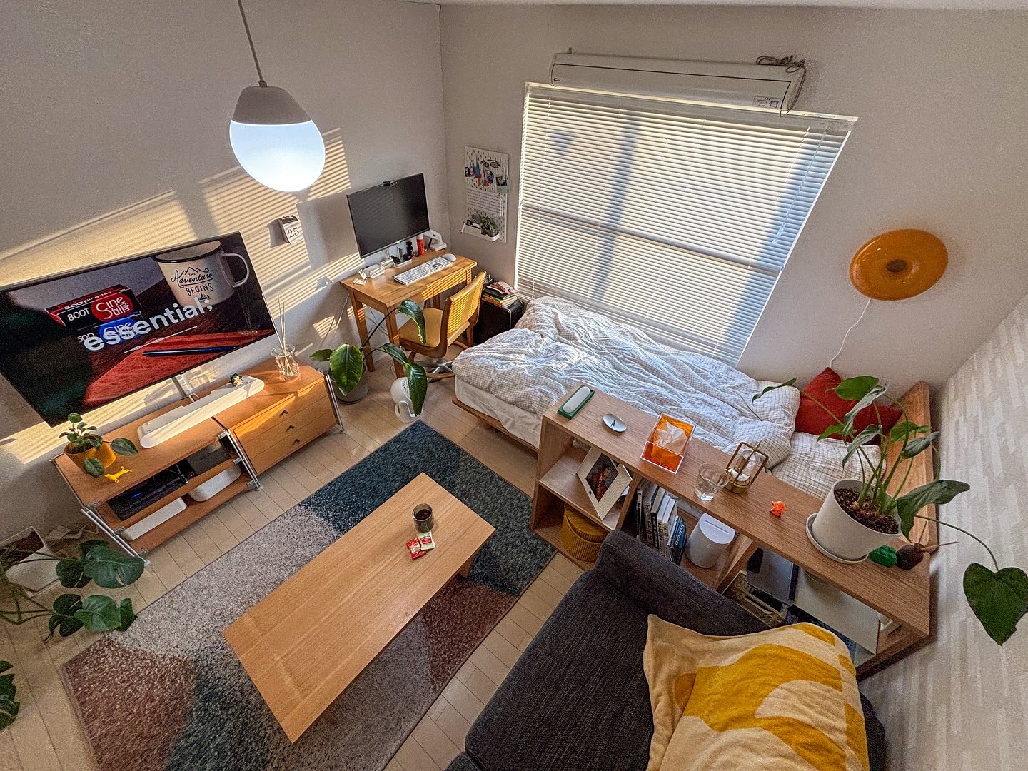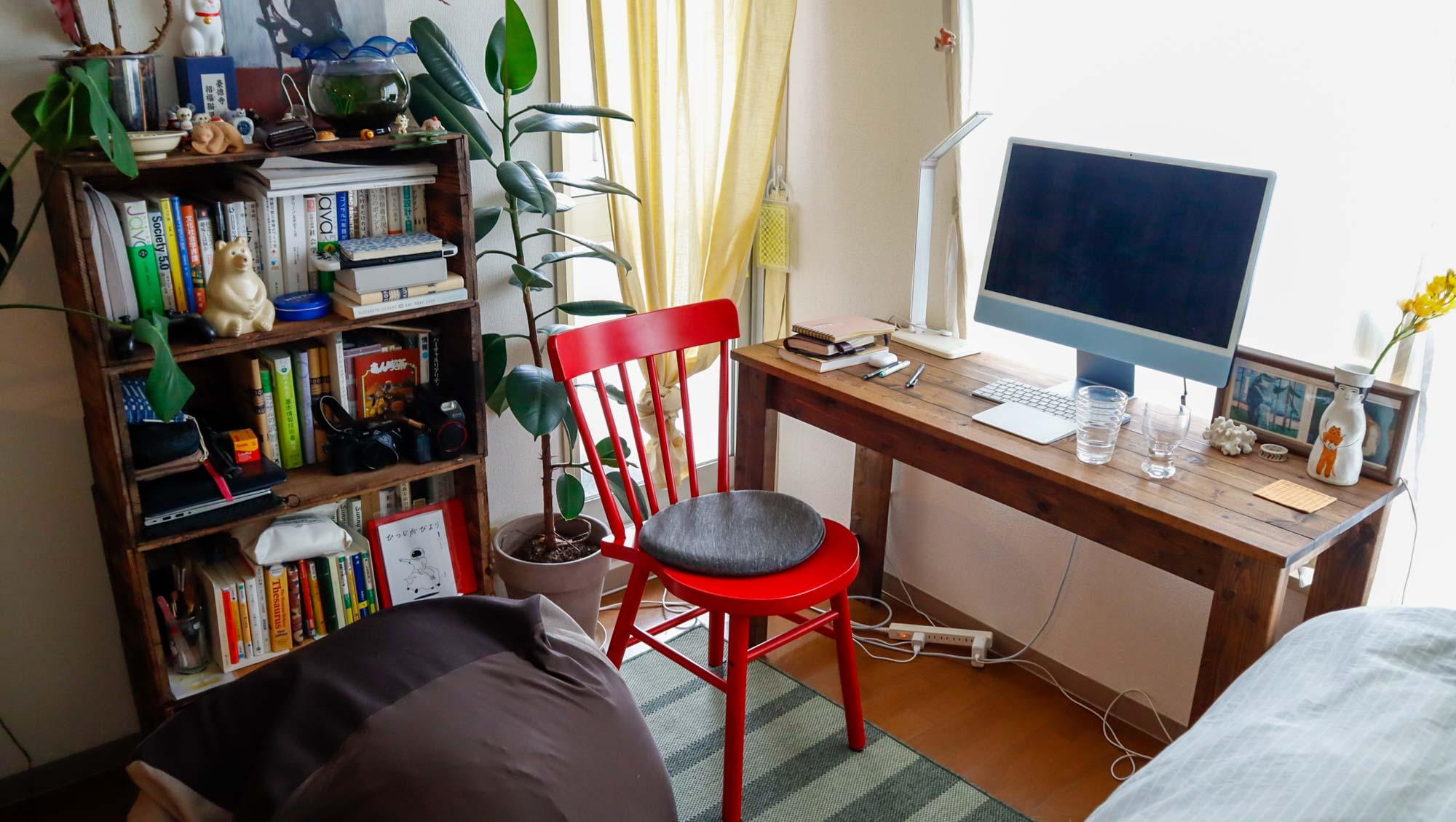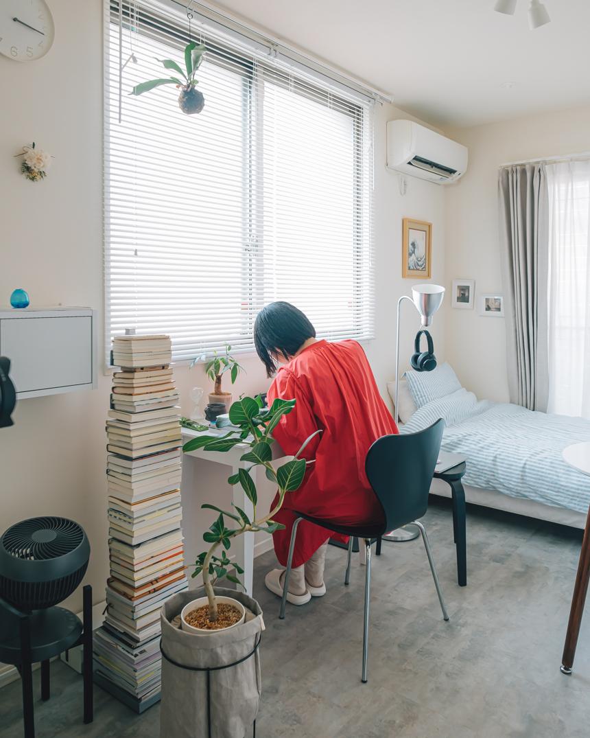 Trong căn hộ 20m², bàn làm việc được đặt làm theo kích thước riêng trên Creema*, quay thẳng ra cửa sổ. (*Creema: nền tảng thương mại điện tử của Nhật Bản, chuyên bán sản phẩm thủ công và đồ đặt làm theo yêu cầu).